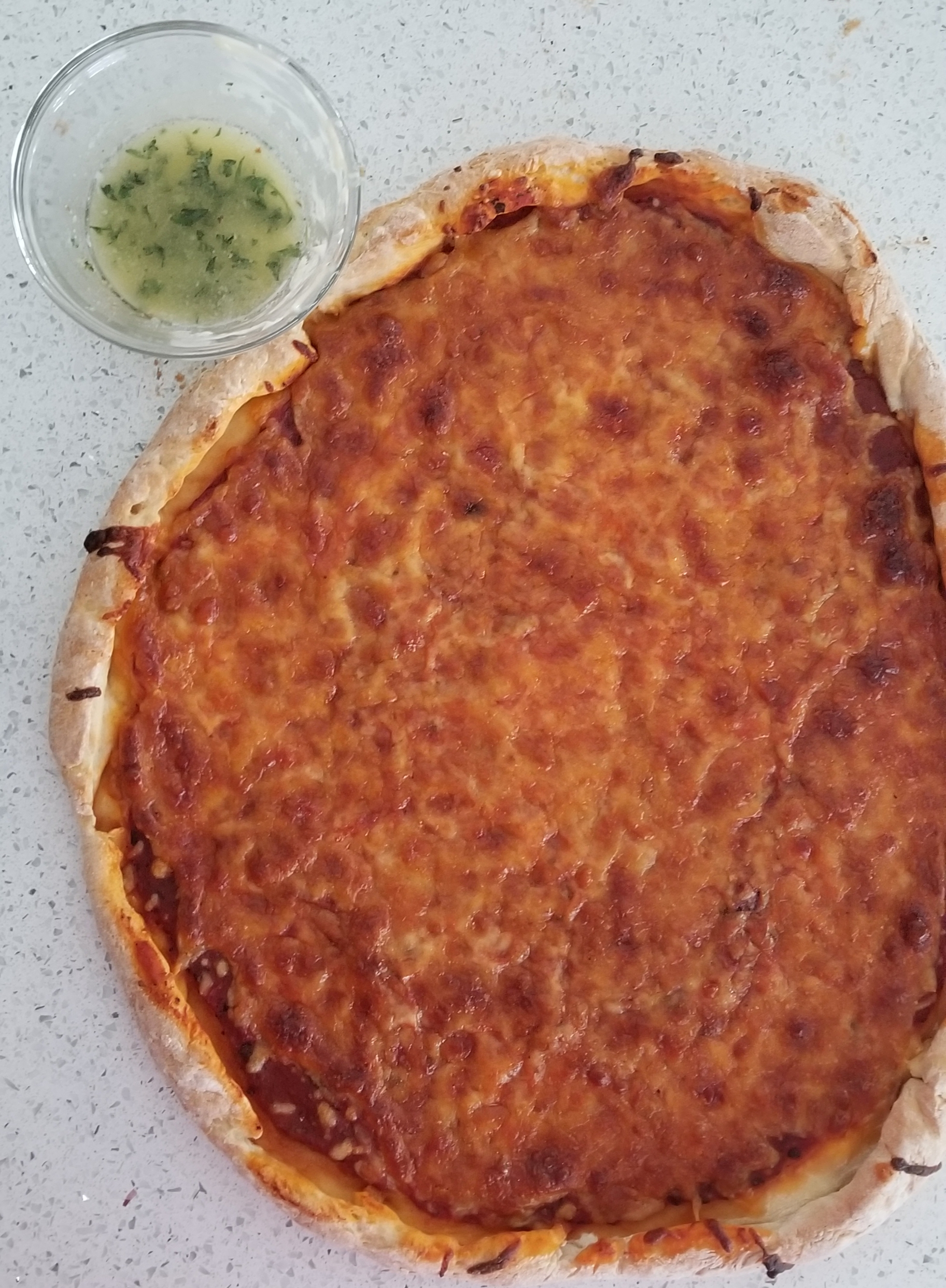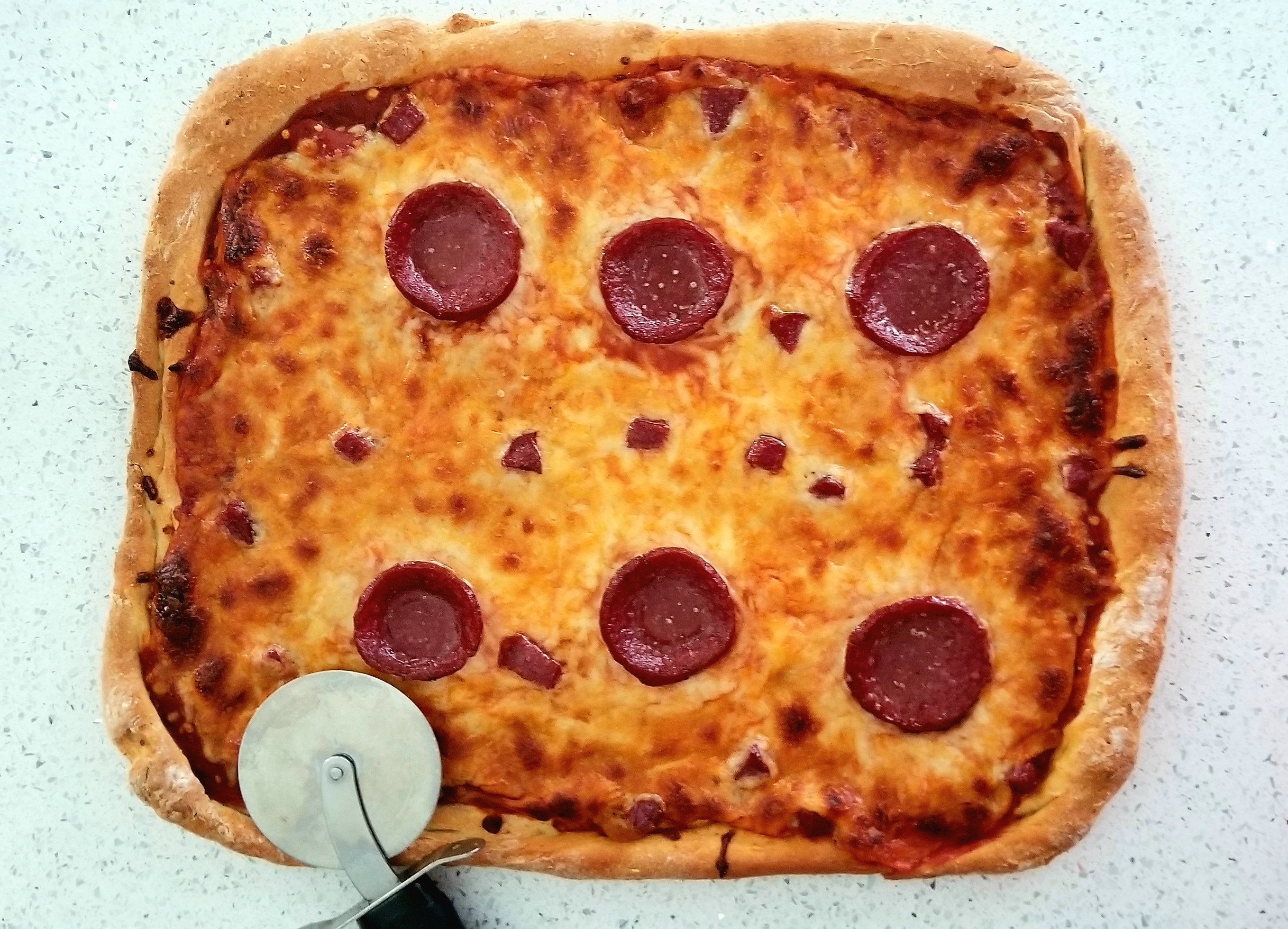 The dough was enough for 2 ~12 inch pizzas. We preheated the oven to 425F and free formed them on 2 oiled, air-bake cookie sheets. For one of the pizzas we baked the crust alone for 8 minutes before removing it and added organic basil marinara (rather than pizza sauce), 8 oz shredded Colby-jack cheese, and salami (my favorite pizza topping). To the other pizza we did not cook it ahead, and did not add salami. We cooked them both on convection (changed to convection when we added both pizzas) for 20 minutes, removed the pizza with the salami and pre-bake, turned the oven off, and left the other pizza in there for another 10 minutes. The crust on both ended up with an even tan color, not too dark, but definitely fully cooked. They were delicious. The sauce was plentiful and sweet, the cheese was easy to bite in to and didn’t pull like a mozzarella deep dish pizza would, and the grease pulled mostly in the salami slices. We did not broil the cheese, and it definitely did not need it. With the oven at 425F it isn’t far from a broil anyway.