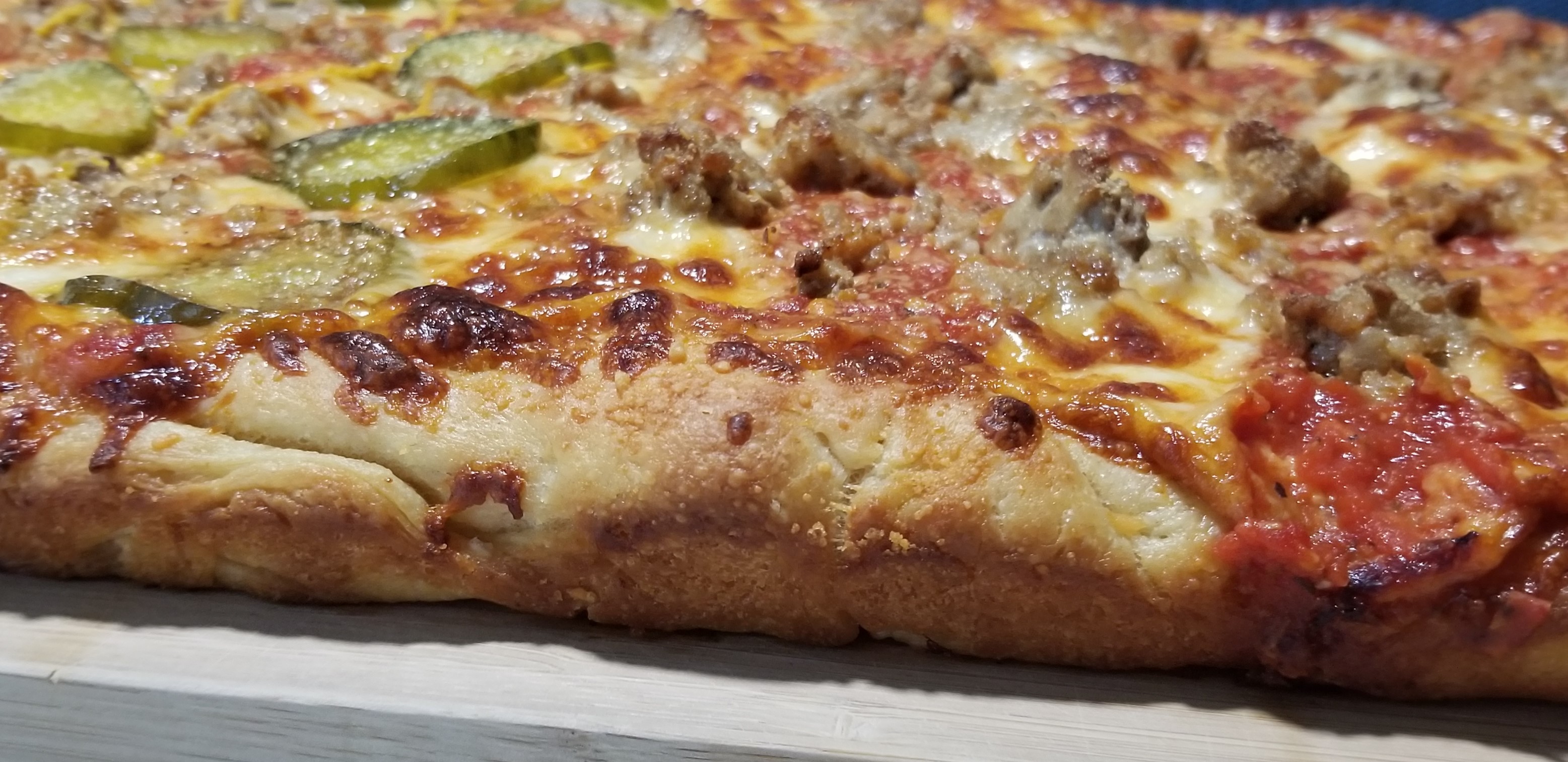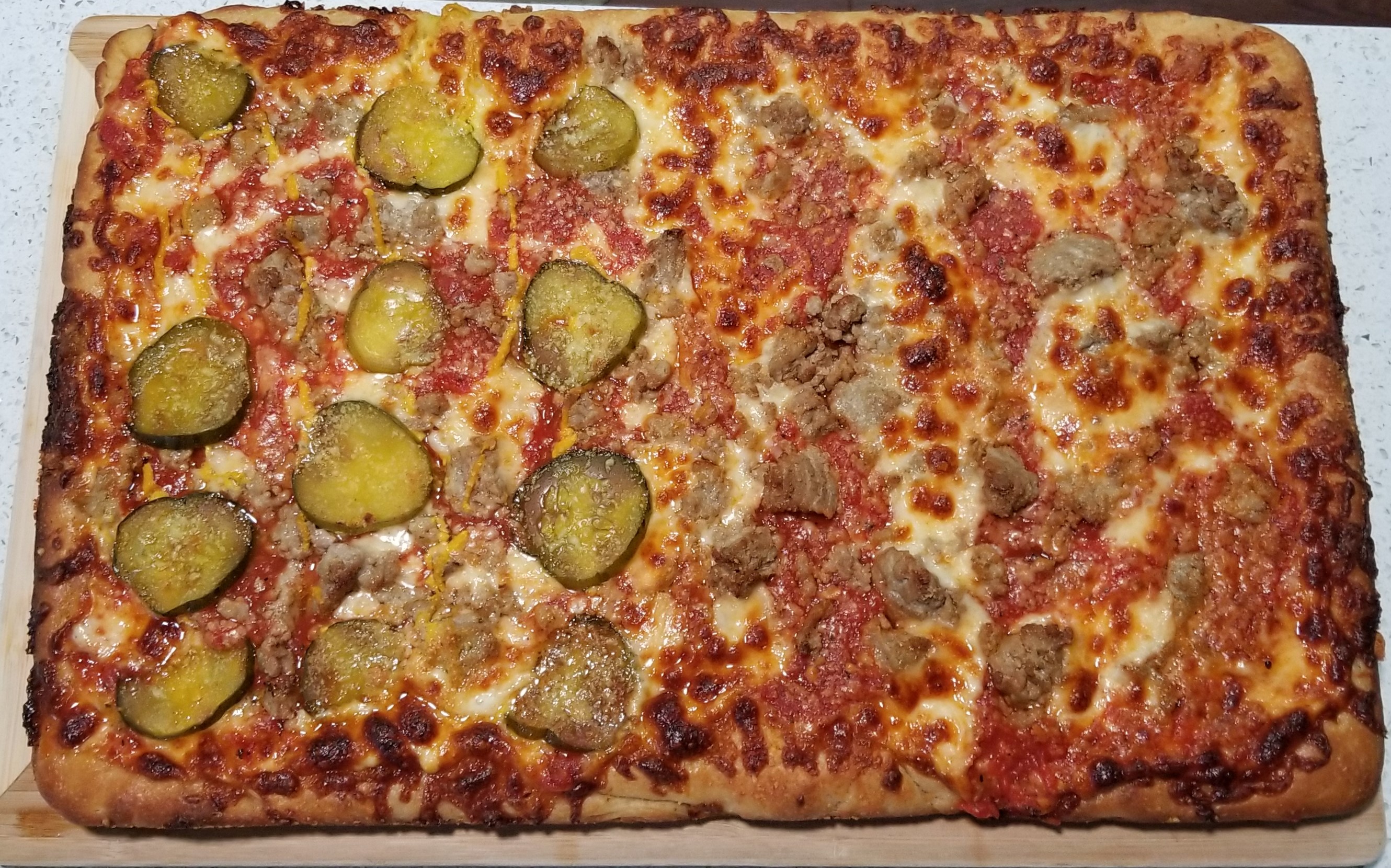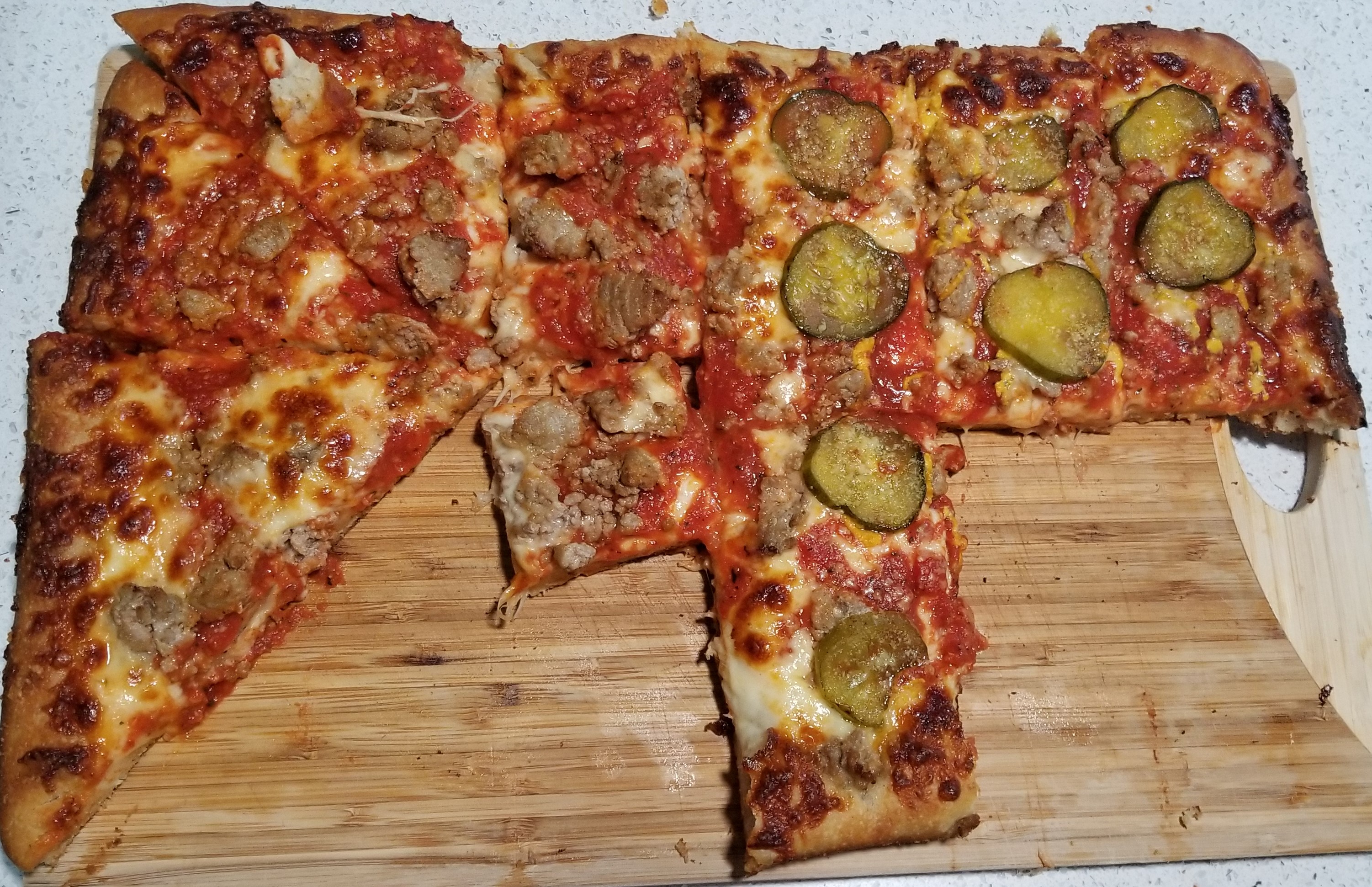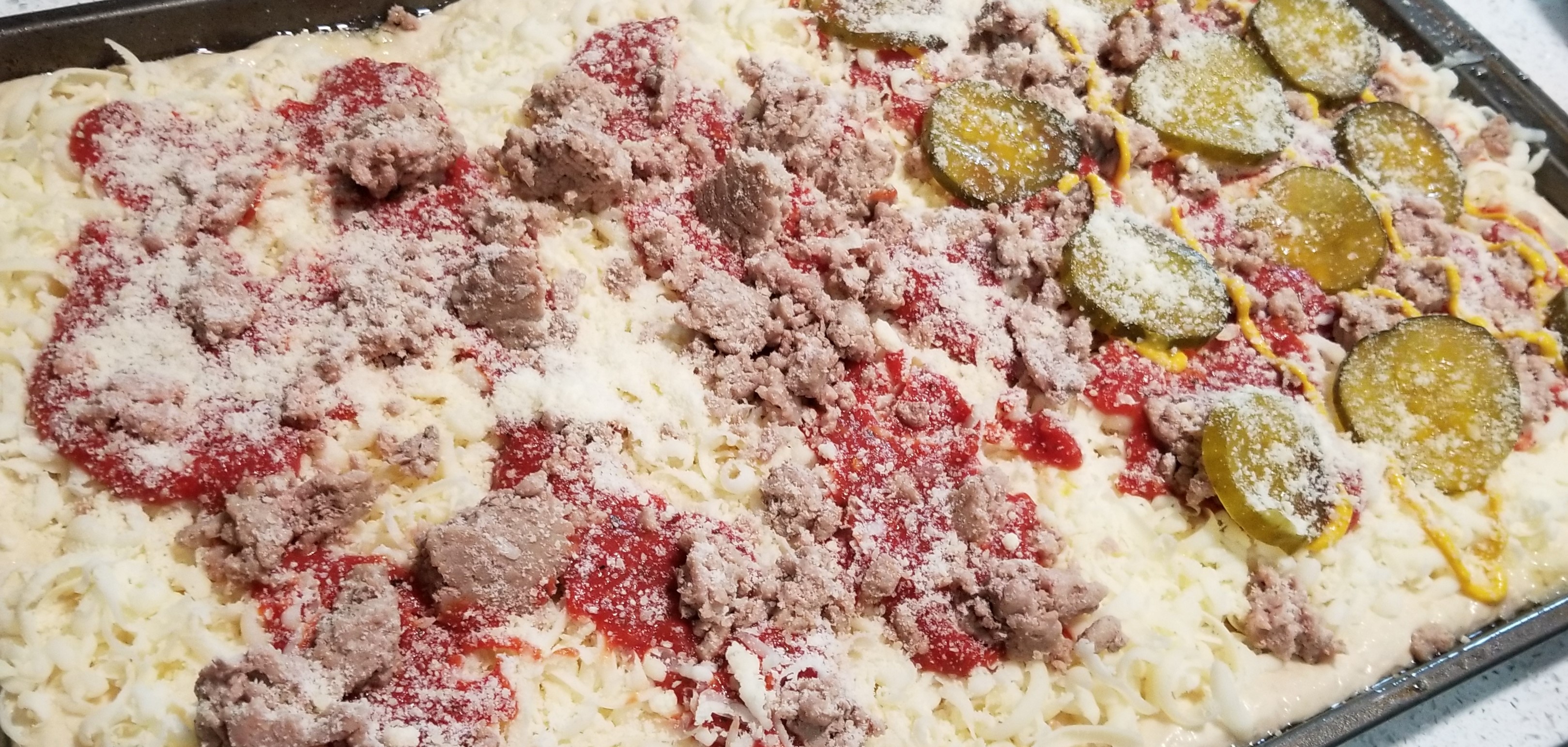 Scoring: 8 of 10. The dough had a little crunch but maintained the softness I enjoy, the cheese was the perfect amount, maybe we could had added more sauce, and the ground turkey half was plenty. The cheeseburger half left the pickles with an extra crunch, and helped keep it extra moist. Next time I would add a little seasoning to the crust, more garlic overall, and cook it for less time.