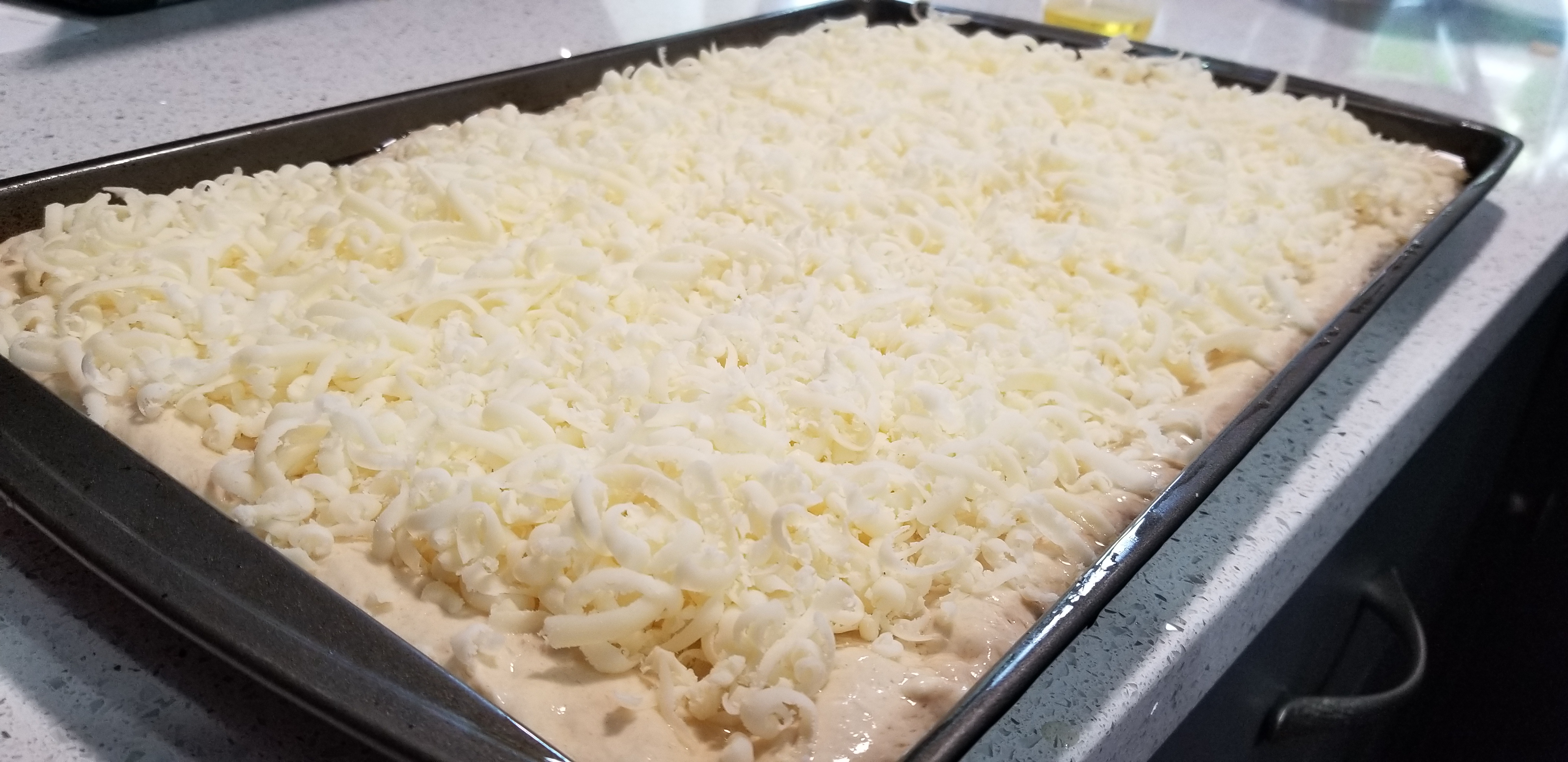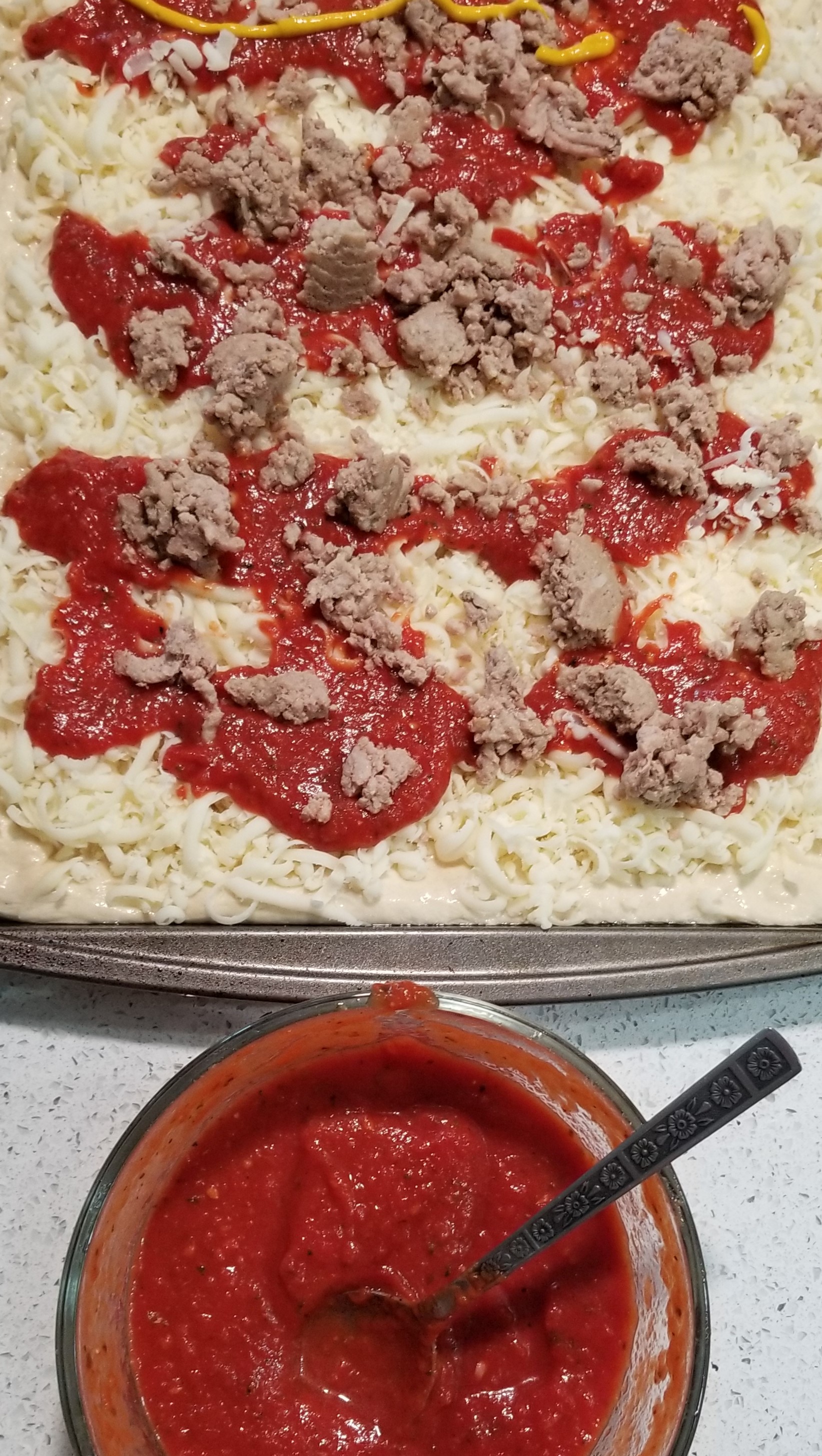 Fast forward to the next day (today), the dough rose nicely, with the condensation bubbled on the underside of the plastic wrap. Still fairly sticky, but much less so. We poured (too much) oil onto a baking sheet with a lip. Then turned the bowl upside-down and encouraged the dough to release from the bowl. We let it sit in the pan for about 10 minutes, stretched it towards the corners with well-oiled fingers, and let it rest again. Eventually it stayed stretched out and we added about 3 cups of home-shredded (KitchenAid attachment) mozzarella. We spooned the homemade sauce on in stripes and made half with ground turkey and turned the other half into a cheeseburger pizza by adding yellow mustard, the ground turkey, and pickles (spicy ones). I am just realizing that onions would have been a good cheeseburger pizza topping too… oh well, next time.