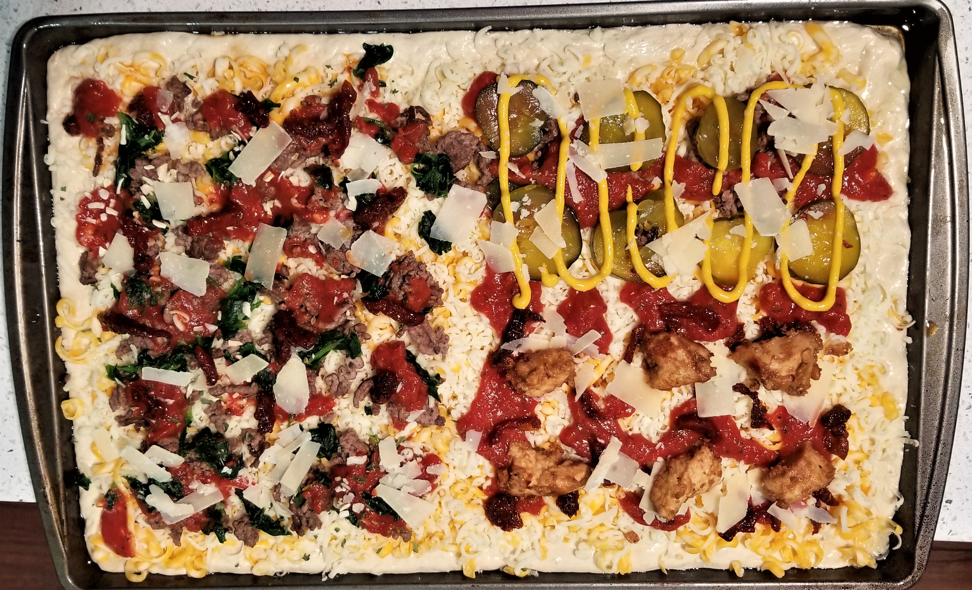 The other half was divided in half again, resulting in 1 quarters of the pizza. Cheeseburger pizza again on a fourth of the entire pizza (as our consistent variable with the modifications), and peanut butter chicken on the other half. The whole pizza then had sun-dried tomatoes, sauce, and 3 cheeses.
