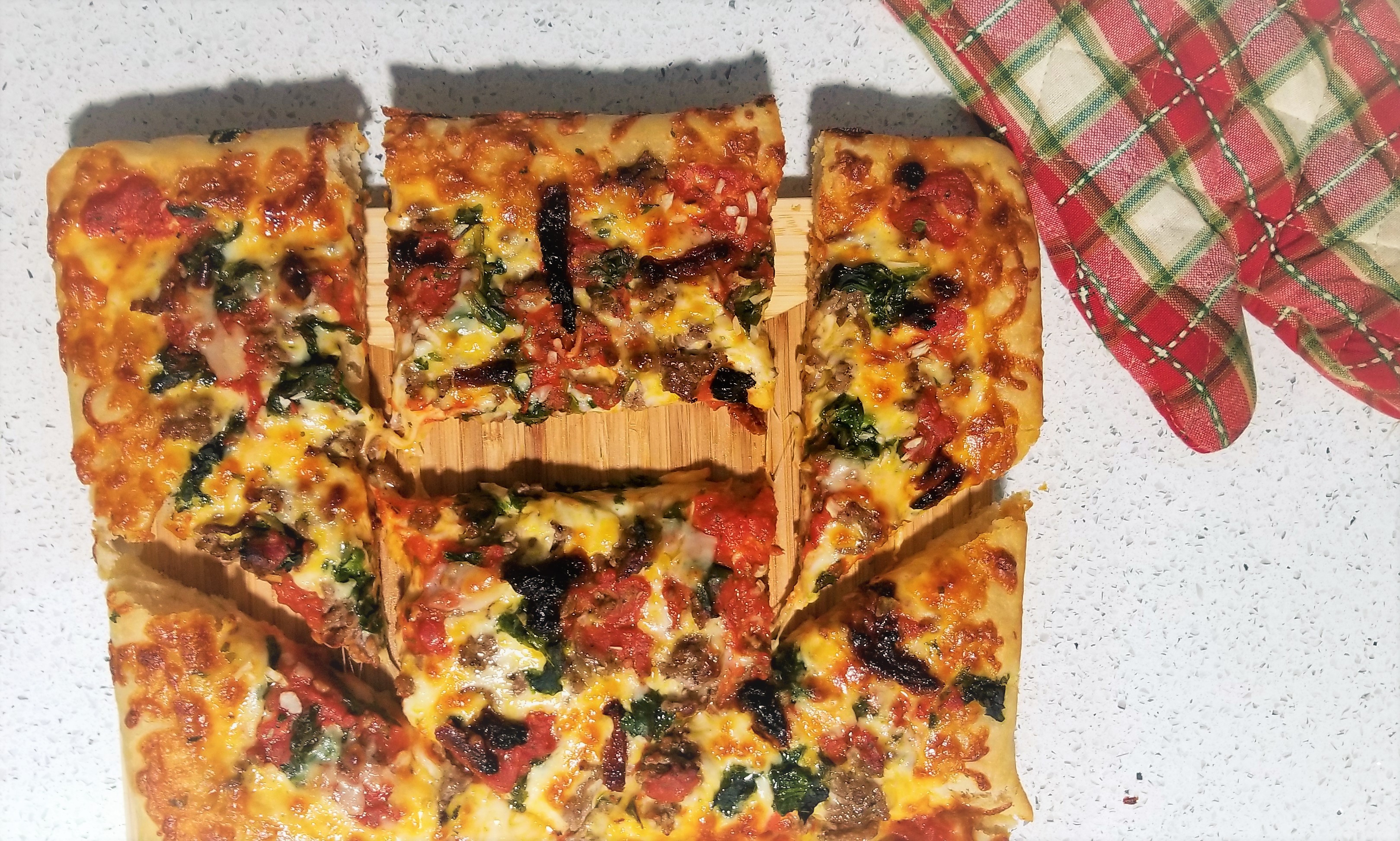 My half of the pizza consisted of 3 cheeses, ground beef cooked with 1 clove of garlic, chopped dehydrated onions, Julian-cut sun-dried tomatoes, blanched spinach, and of course homemade pizza sauce. For the spinach not to burn in the oven it is important it goes on a little wet.