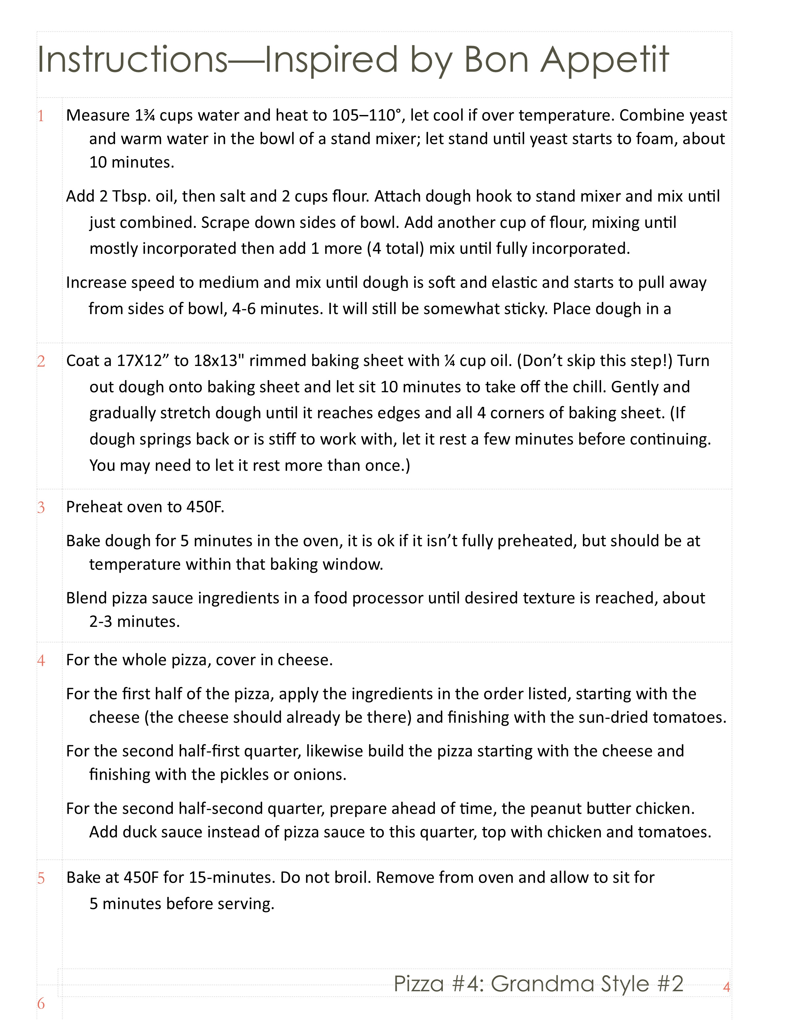 Take-Home Tips: For the crust – not everyone will enjoy the softer crust. My recommendation if you like something in the middle of Pizza #3 and #4 would be to set the oven at 475F, cook the dough alone for 5-7 minutes, then add the toppings and proceed with another 15-minutes cook time.