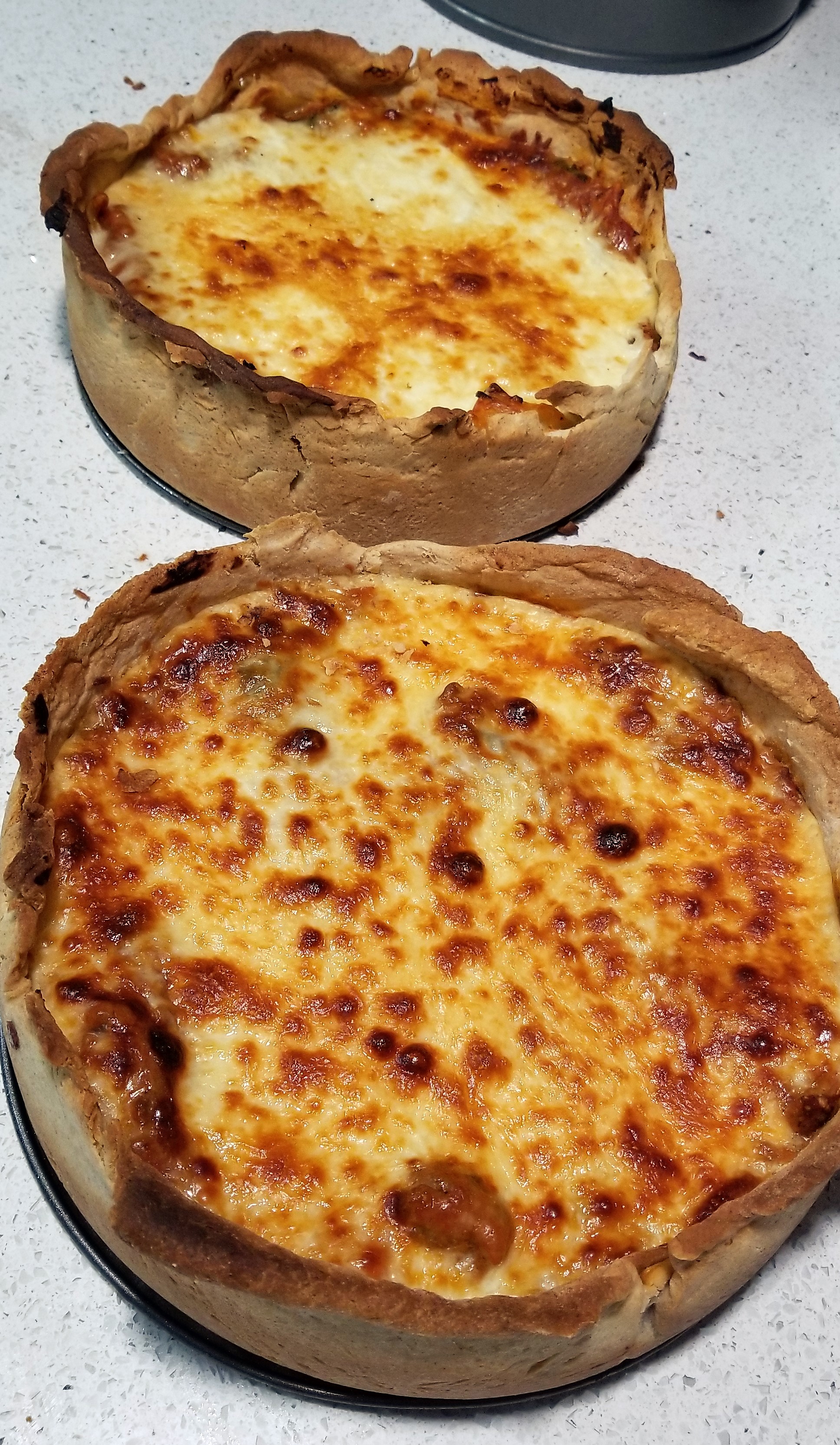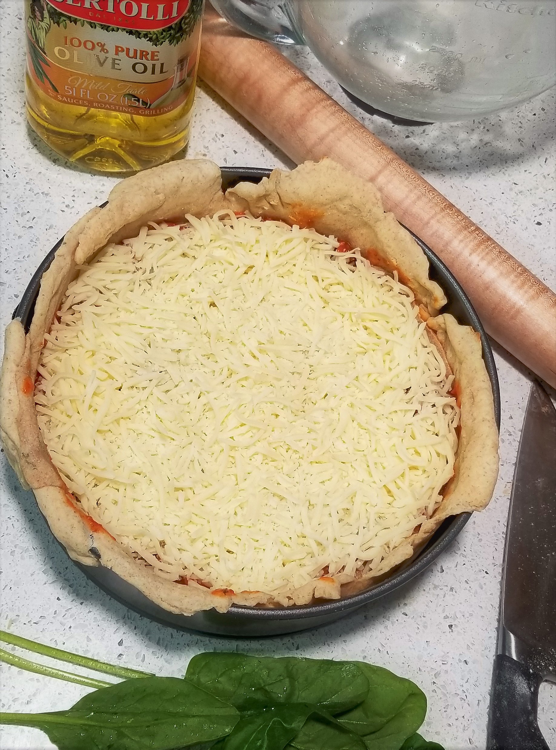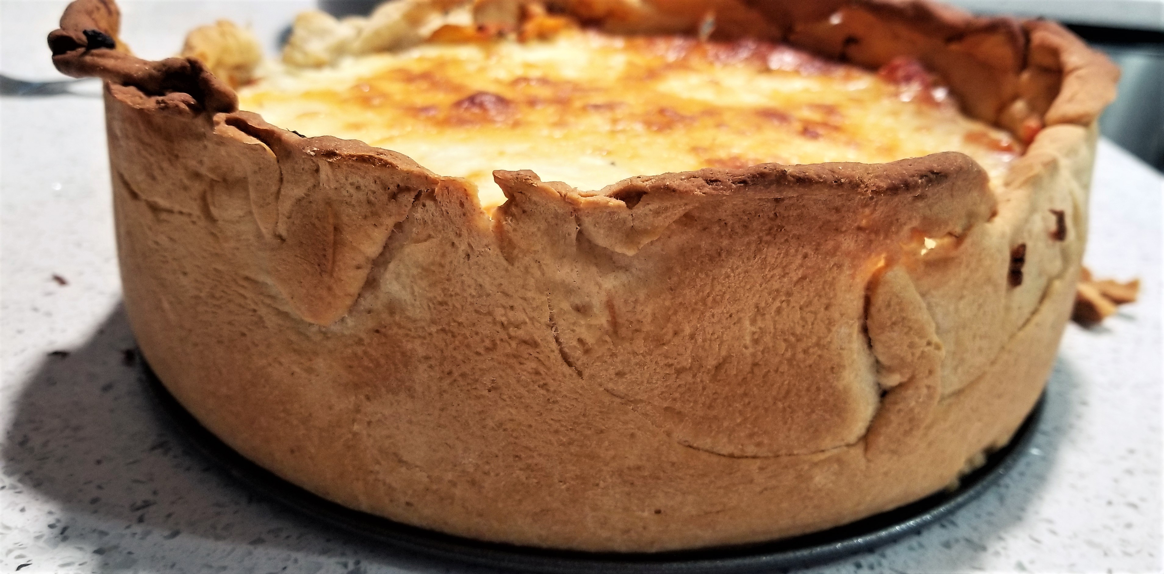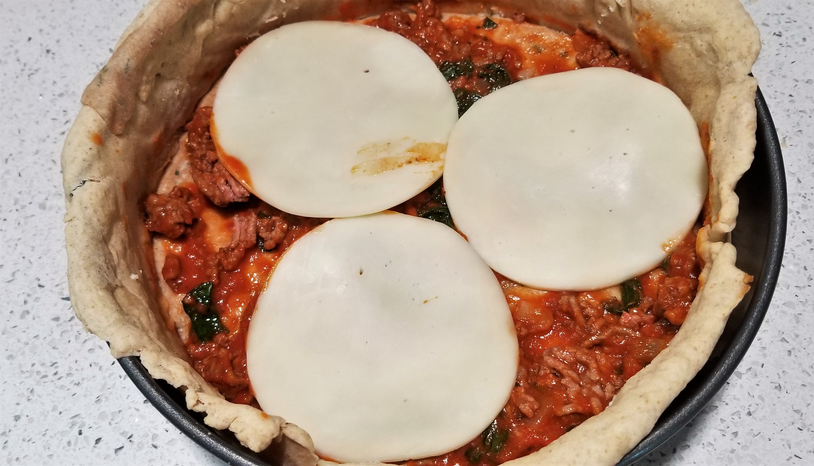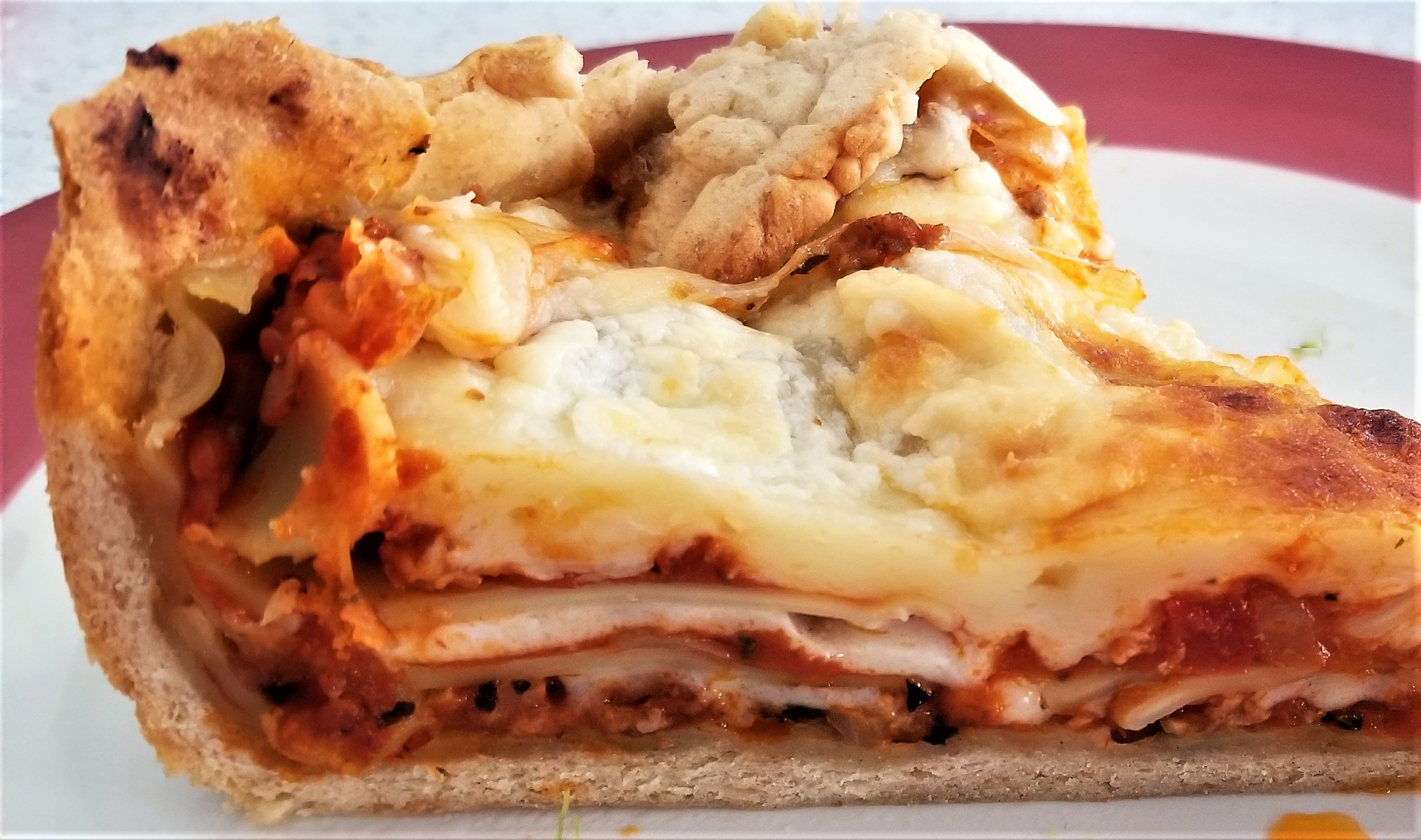 Take-Home Tips: The flavors were cheesy, but honestly could have incorporated more spice. You might add another onion, 2 more cloves of garlic and some basil, or the hot Italian sausage could do the trick. If you aren’t a fan of too much spice, then it will be ideal as described. The top edge of the crust was too crispy, as it was not covered by the layers. To fluff the layers some, try adding shredded mozzarella with each cheese step. Alternatively, cut the crust, don’t pull it to the top of the pie dish, or use a shorter dish. Although we baked ours at 425F for 30 minutes, after the 7 minutes of blind bake, I went ahead and modified the recipe below to reduce the crispy crust along the edge. We are accomplishing this by baking the crust at a lower temperature for a longer period of time (3 additional minutes), then adding the layers and continuing to bake 5 more minutes than the original 30. Both instances have 2-3 minutes of broil. To reduce the time it takes to prepare day of, make the meat sauce, cheese mixture, and doughs the night before. For the doughs, use active dry yeast rather than fast acting if you make ahead.