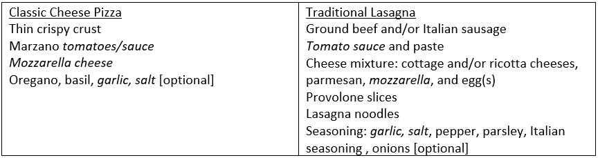 There are a couple of ingredients we see on both lists: tomato sauce, mozzarella, garlic and salt. Of course everyone feels differently, if not passionately about what a pizza or a lasagna should entail. Generally, most of the recipes I saw repeated these essential ingredients.