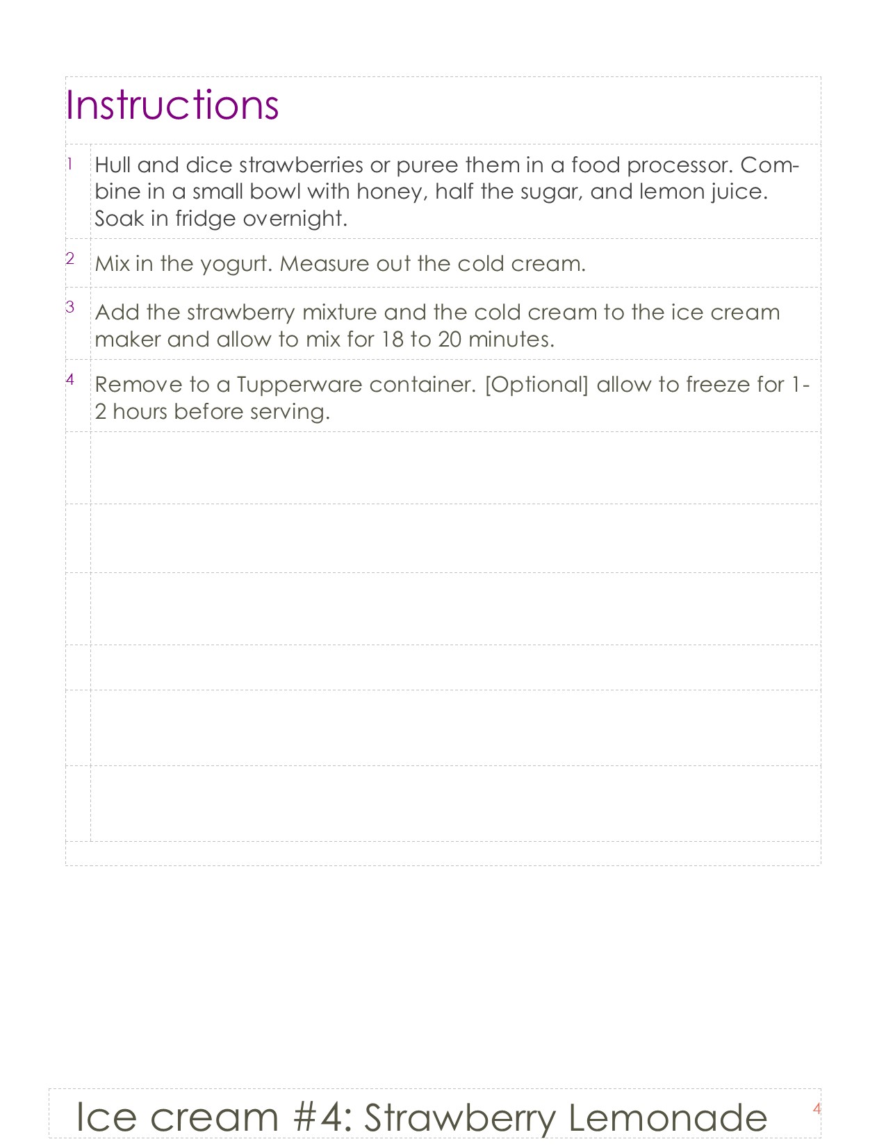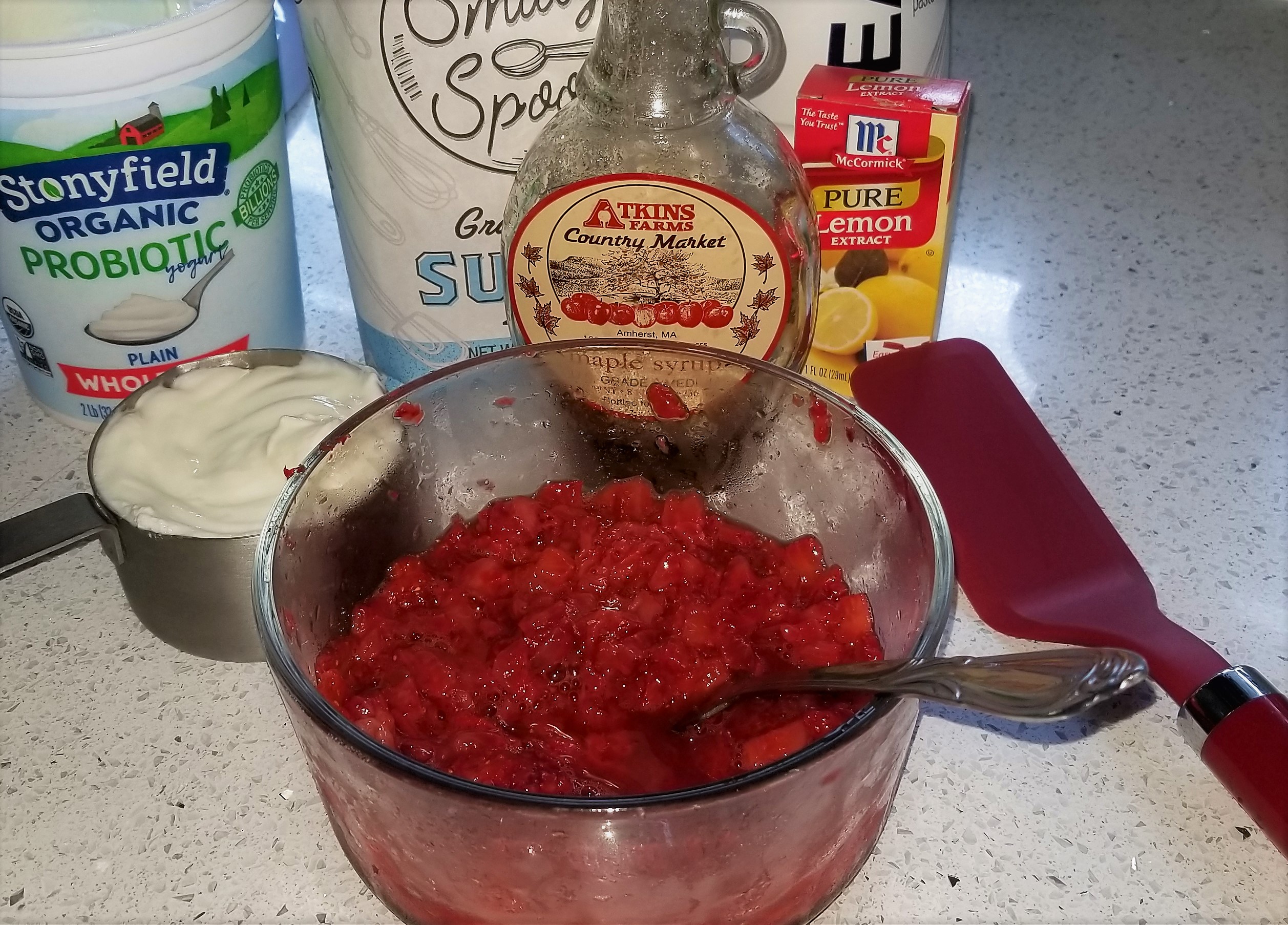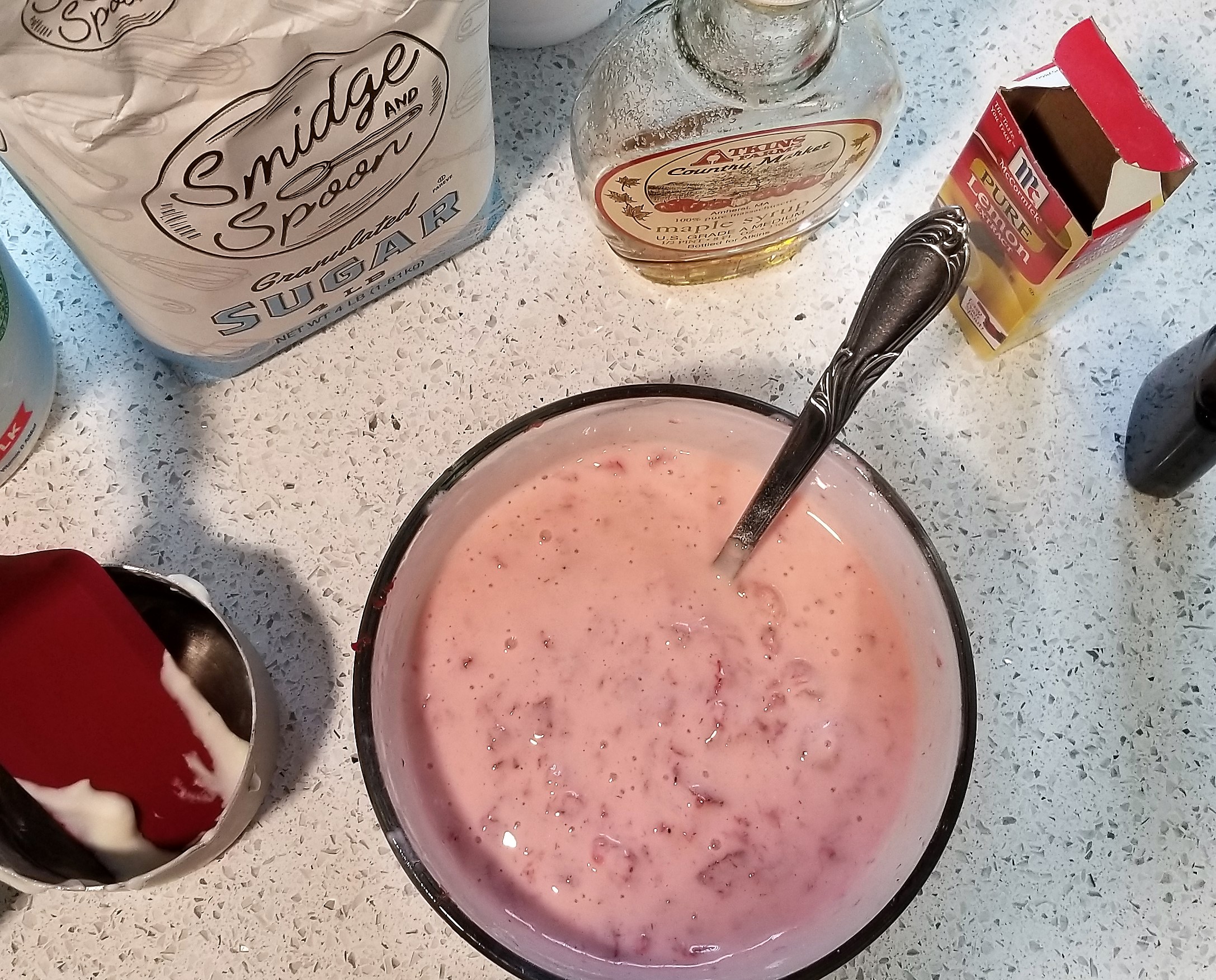 To start I cored the top of the fruit, diced them, and let them soak overnight (about 8 hours) in 1 Tbsp. of lemon juice and ½ tsp of honey. Maple syrup is another option, any liquid sugar solution. The next day I smashed them with a fork and stirred in the yogurt then the cream before adding it to the machine. Yum!