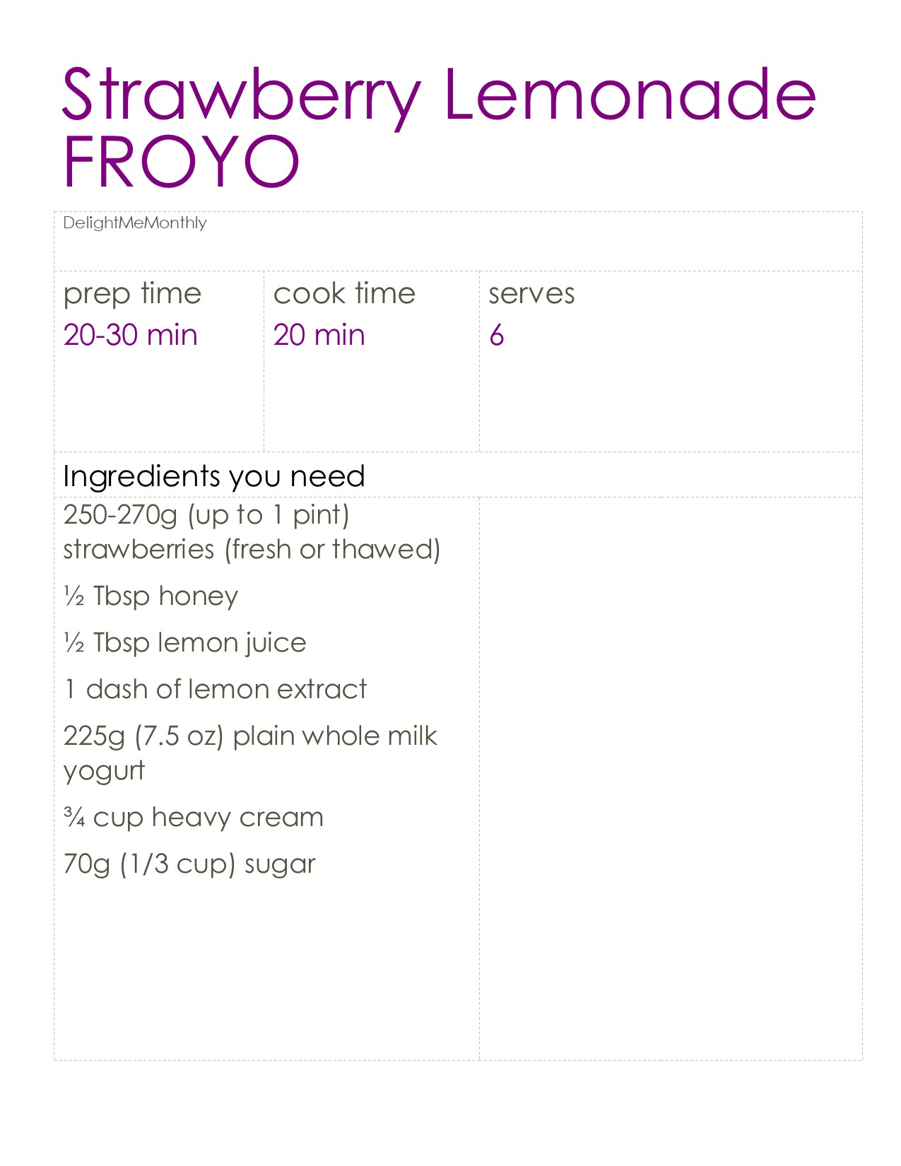 Today, I helped move my sister-in-law in the heat and after 9 hours up and down from each third floor apartment, I could have eaten this whole 3 cups of FroYo. Before we headed over with our muscles (ha!) I whipped up this lemon infused strawberry yogurt. That is how quick it is to make FroYo. During our taste tests, we were surprised by how acidic and lemony the flavor was. I really wanted more of a strawberry, but this ended up being more unique and fun. Would have been great as an icy drink during lunch today.