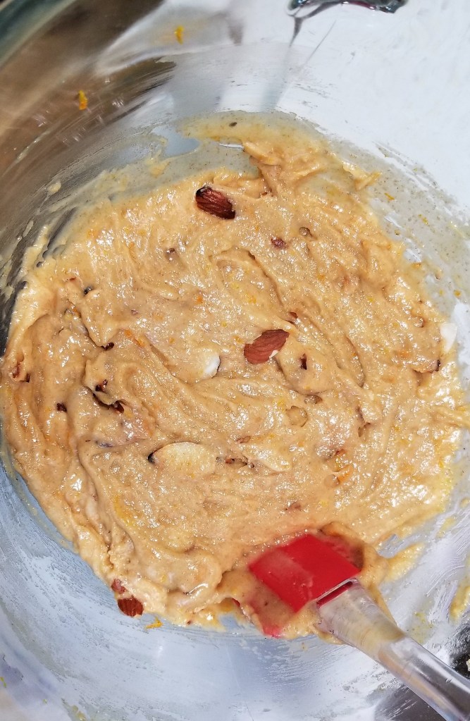 Take-Home Tips: The dough can be made ahead one day before and kept in the fridge. Try adding coconut flakes to the toasted almonds if you want a hint of coconut. When adding both honey and oil, measure the oil then add the honey to the same measuring cup so it comes out more easily. You should not need to scrape it out this way. If you wait until the loaves are cooled after the first bake they will be too hard to cut. When cutting the loaves, drag the blade across the crust until you break the top layer, then press the knife down to the surface rather than sliding the knife all the way through. This will reduce cracks and breakage. If your loaf is domed, be sure to break the whole surface before pressing down through the bread and almonds. This recipe pairs nicely with Warm Spiced Apple Cider as it will use your remaining orange that you zested for this recipe.
