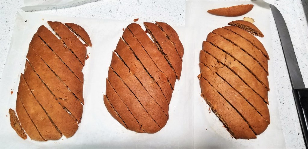 Thankfully for me, making biscotti is a cinch! I did not have any trouble with this recipe. If you have trouble see below for some ideas. I am not crazy about this flavor but went on to make two other flavors in the exact same manner, ignoring the original instructions, and they worked even better. Stay tuned for Dark Chocolate Almond and Almond Pumpkin Spice!