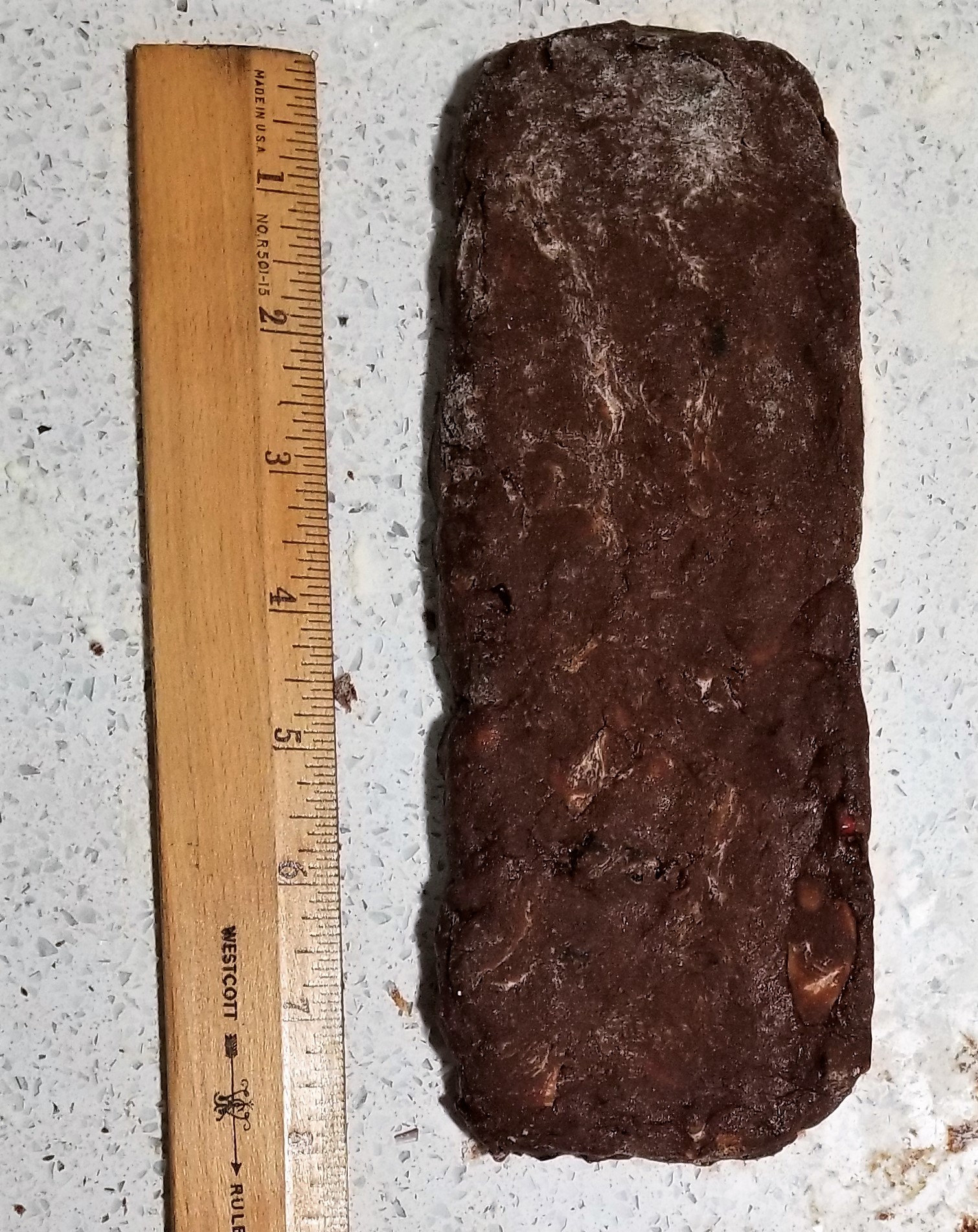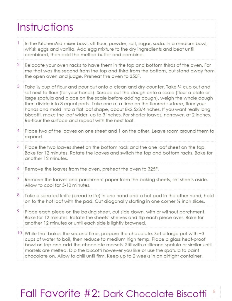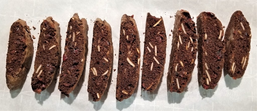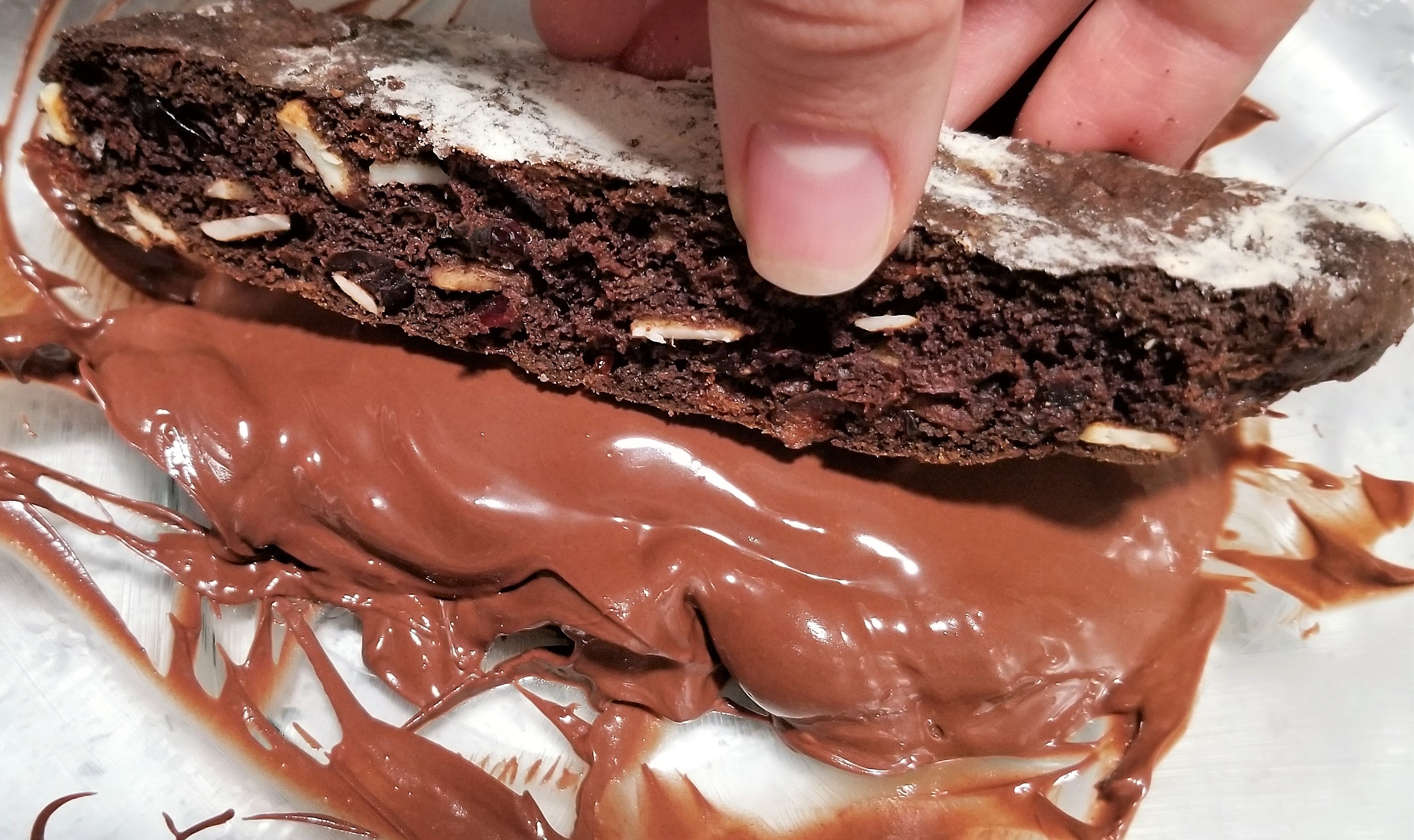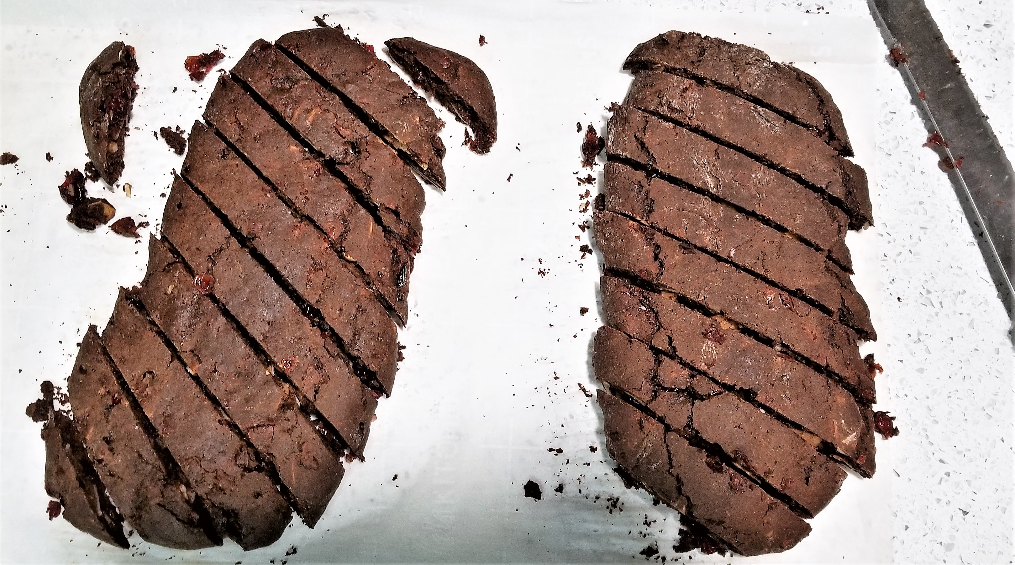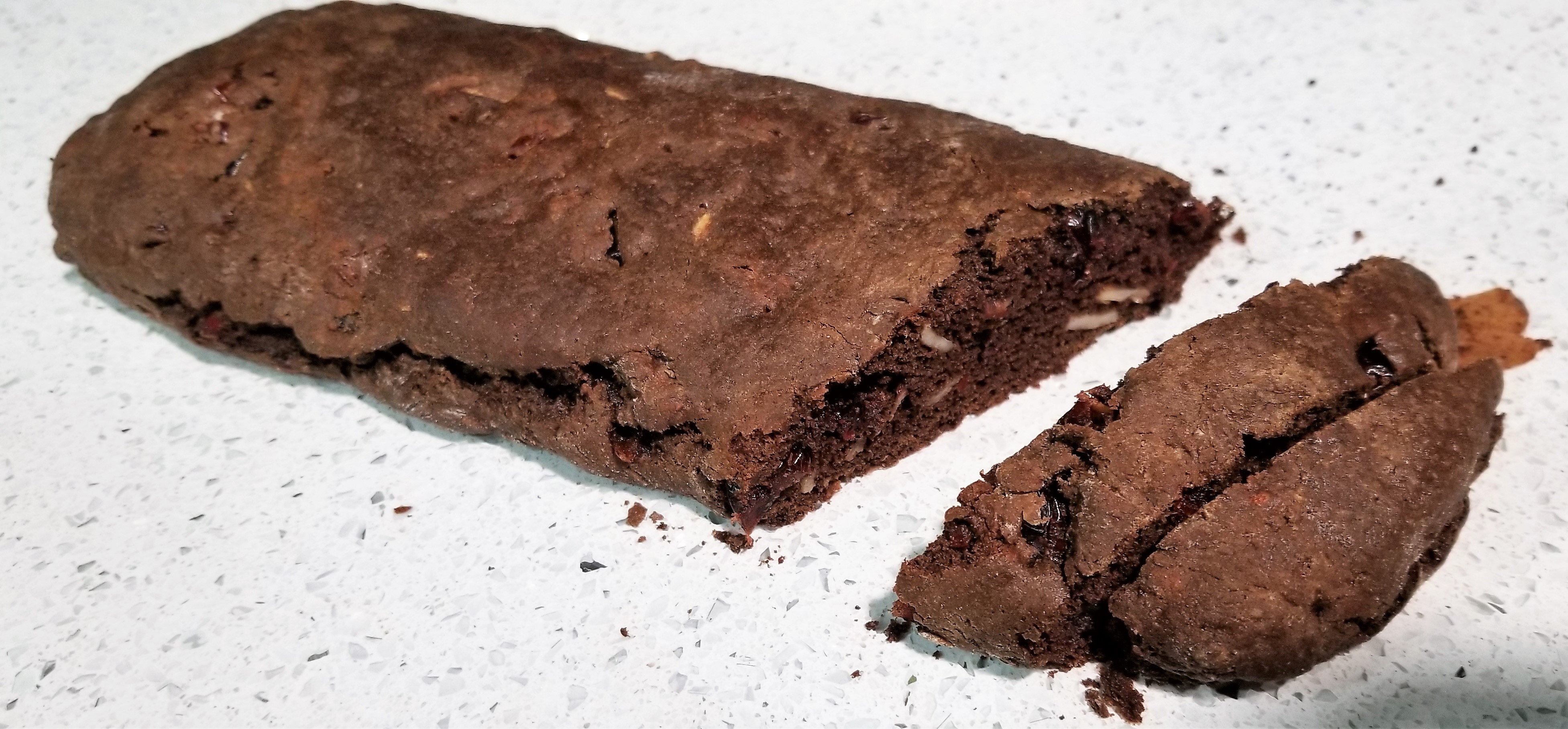 Take-Home Tips: Because the chocolates are so bitter, this biscotti is better enjoyed with coffee, hot chocolate, cider, or ice cream. For a more fall-flavor, try adding cloves or pumpkin pie spice. If you want a more bread-like feel, take the first bake for 2 rounds of 10 minutes and only 2 minutes on each side for the second bake. Note that the loaf will become more firm as it cools.
