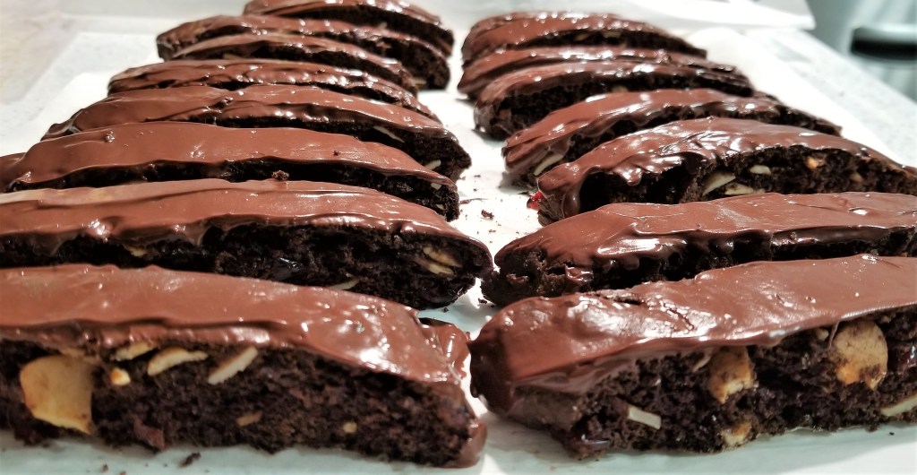 The dark chocolate biscotti could easily be converted into a Christmas treat by sprinkling crushed peppermint atop the ganache before it cools completely. Adding peppermint extract to the dough would also convince your friends this is a wintry snack.