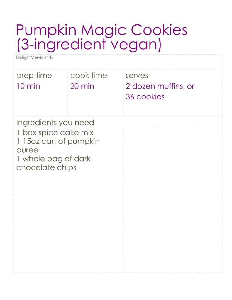 We have made about 6 batches of these this month. There were muffins, mini cookies, regular cookies, ones with vanilla cake mix, ones with pumpkin spice puree, and who knows what else. We continue to agree that the plain pumpkin puree with the spice cake mix and dark chocolate, or even the semi-sweet morsels, make the best combination.
