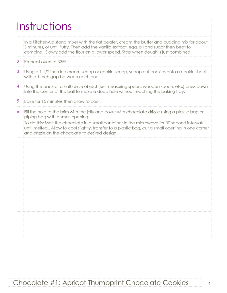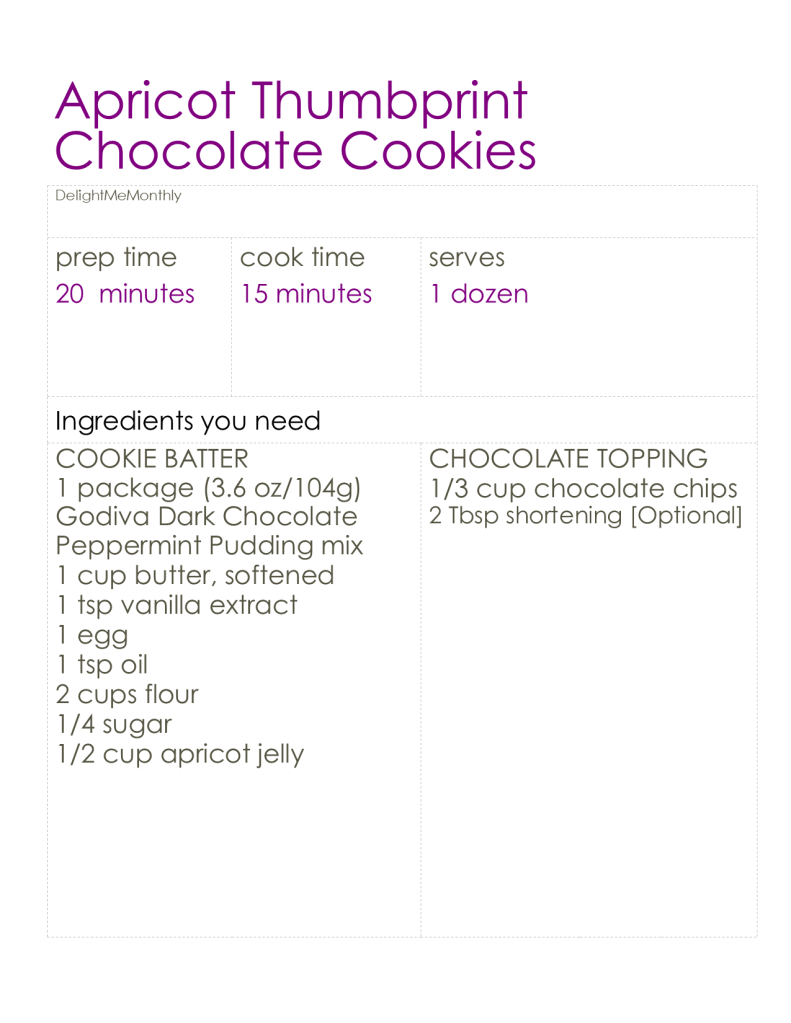 Take-Home Tips: To make the thumbprint hole in the middle, you are better off not actually using your thumb. We used the back of a teaspoon, but any similar small, round solid would work better to make that shape than your thumb. This is especially true if you have long nails. If you want to use your thumb, choose horizontal and add more jelly. Of course you could use grape, strawberry, or whatever jelly you are trying to get out of your fridge. The possibilities are endless for a Smörgåsbord of jelly thumbprint cookies. I would however, recommend the apricot or strawberry for the chocolate cookie. If you are not a peppermint fan, regular pudding with almond or just vanilla extract would be good substitutes in the cookie.