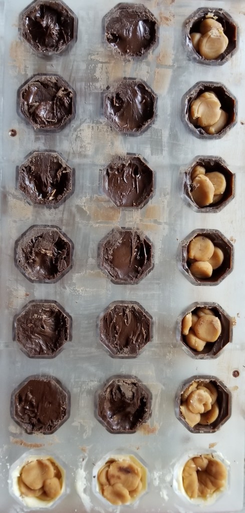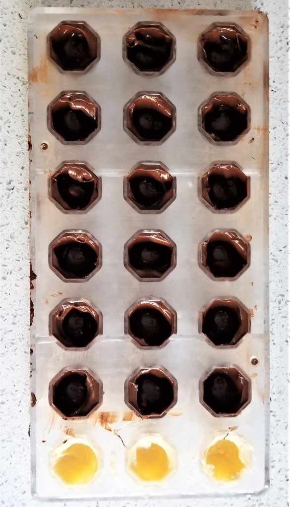 - Fill in the mold with desired filling, about 3/4 of the way full, being sure to leave a small gap for the base of the chocolate.