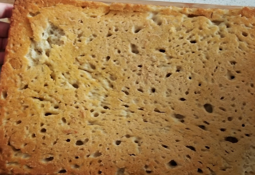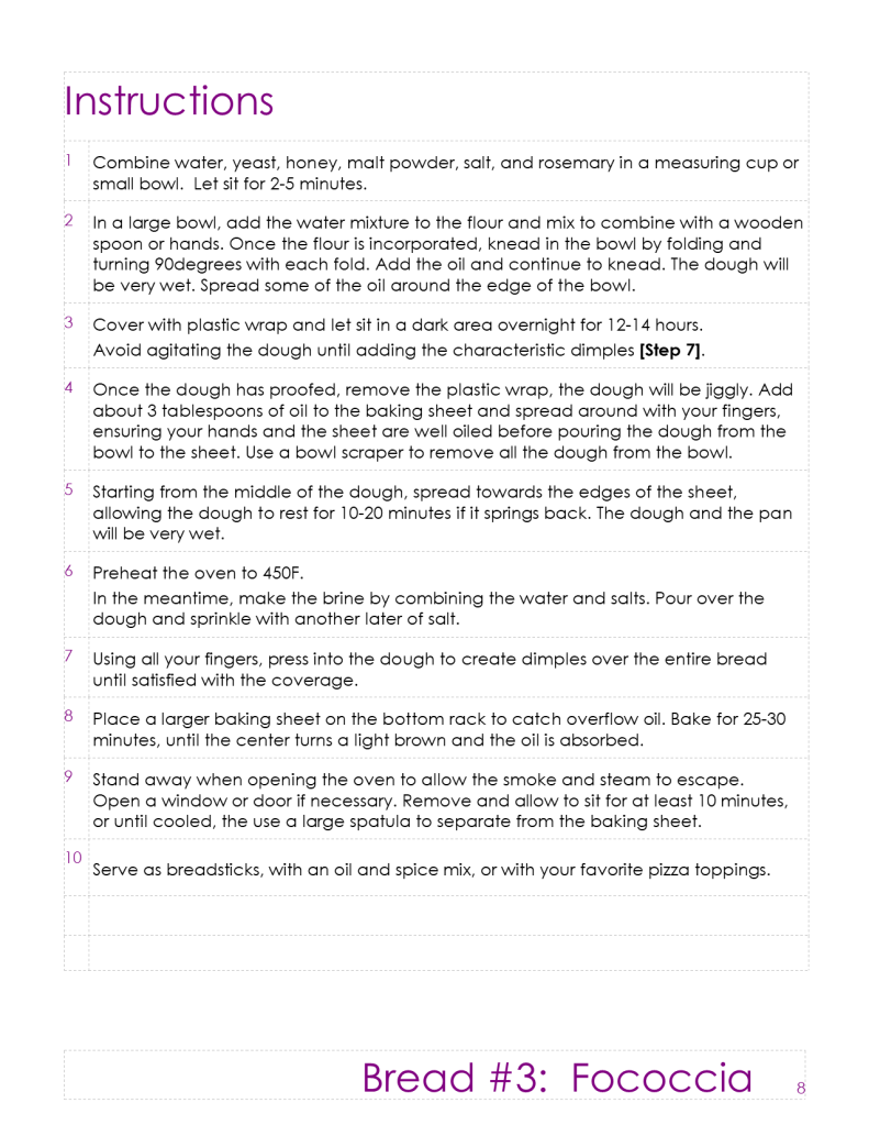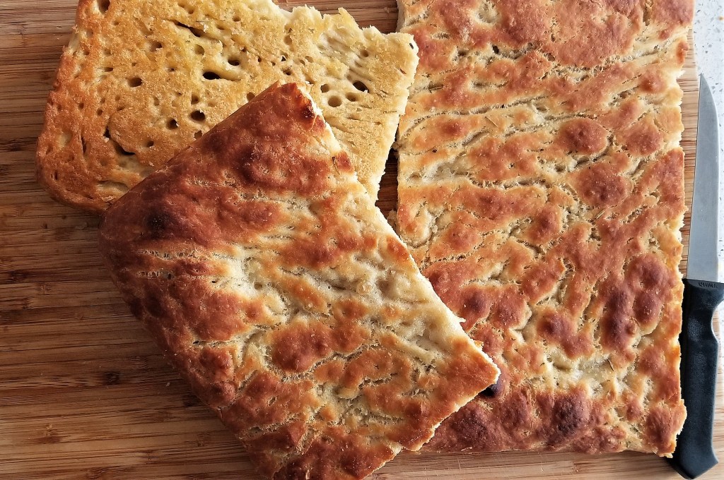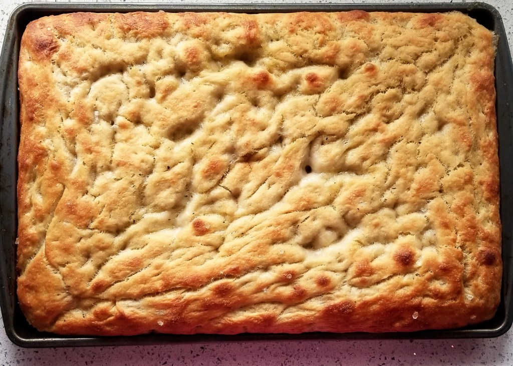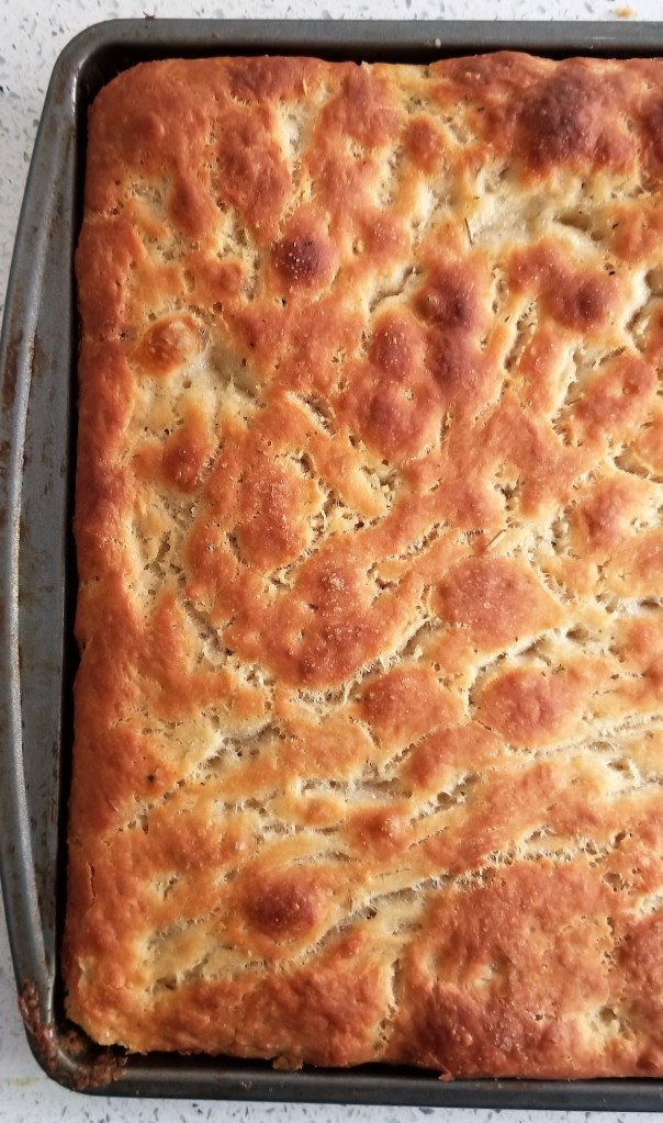 Take-Home Tips: Bake the bread on a high-rimmed jelly roll pan or baking sheet. I would recommend a 10x15in pan and reducing the ingredients if your pan is smaller. If you think there may be too much oil, you are wrong because there is no such thing, but it could overflow in the oven, so definitely put a larger pan on the bottom rack. If the oil spills over, there could be sparks where the oil hits the heating element and when you remove the bread from the oven, the smoke will escape, resulting in the fire alarm screaming. We try to avoid setting off the fire alarm.