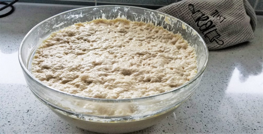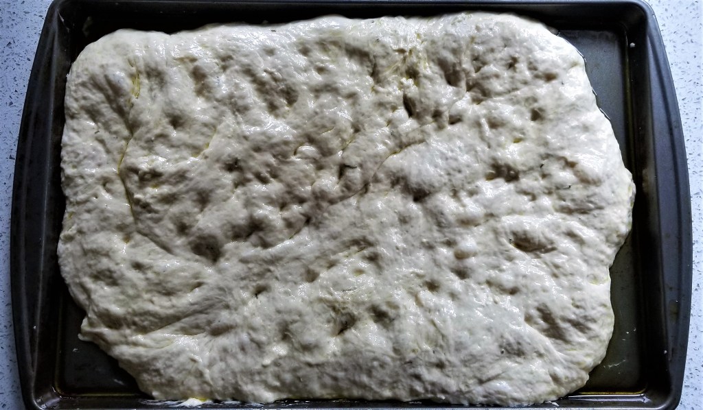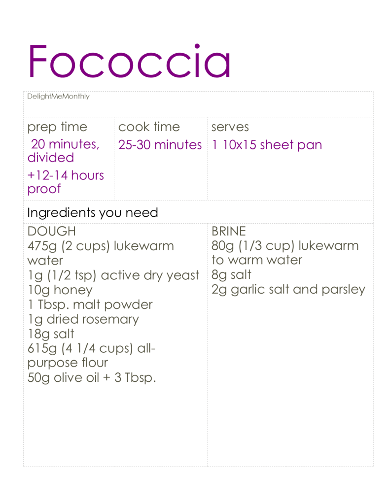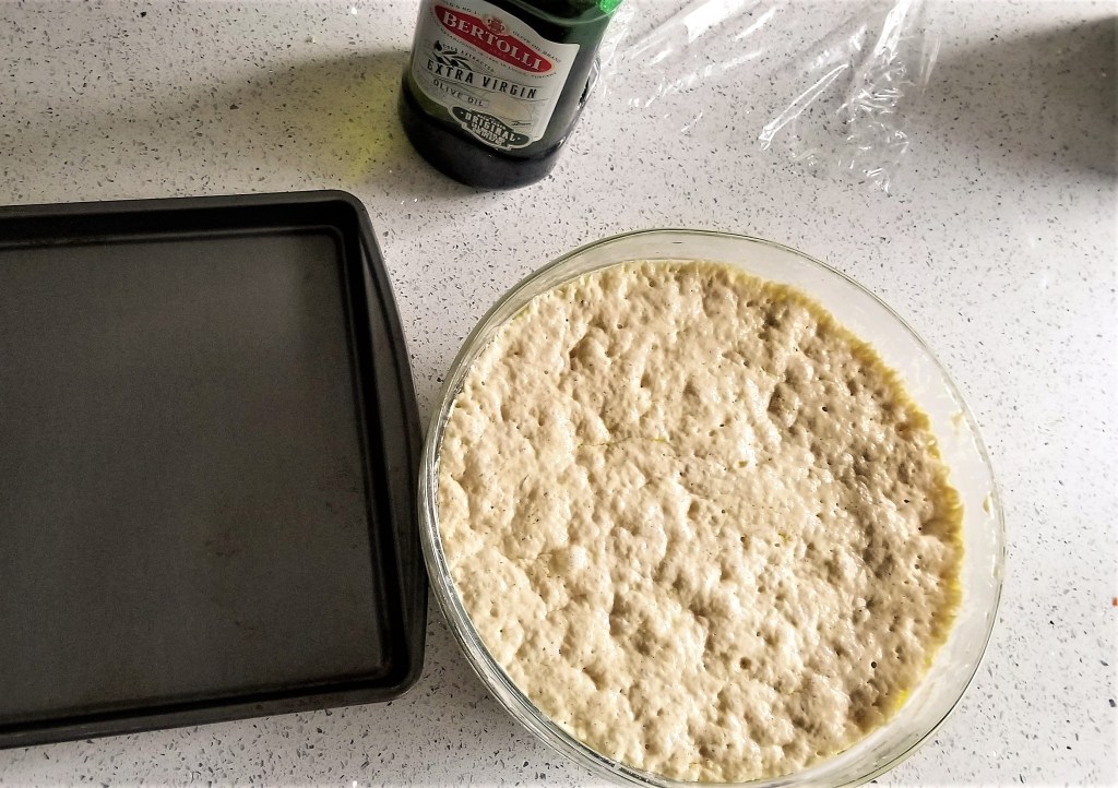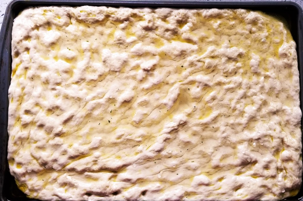 This bread is ideal to start on a Friday or Saturday night, or the night before you have the morning off. You will need 40-50 minutes to prepare and cook the fococcia after it has proofed.