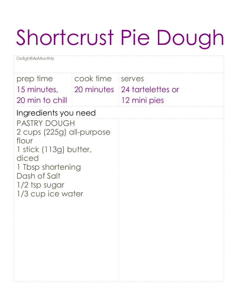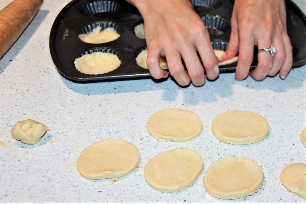 Take-Home Tips: The Shortcrust is easy to make, but be careful not to over-mix or it will get tough and be hard rather than crumbly and a pleasure to bite into. Also adding only the bare minimum water is key to reducing the gluten build up. If your crust is too crumbly (short) it probably had too much fat, was over-mixed, or needed more water. Adding the shortening helps reduce this possibility. Do not skip refrigerating the formed pies prior to baking because they can shrink away from the sides and ruin your shape. Ensure all ingredients are very cold, add very little flour when rolling out but I did find I needed to flour my rolling pin and work surface, use parchment or wax paper to roll out if necessary, and keep refrigerated as needed. The dough recipe makes enough for 1 tray of each filling, 6 mini pies and 12 tartelettes.