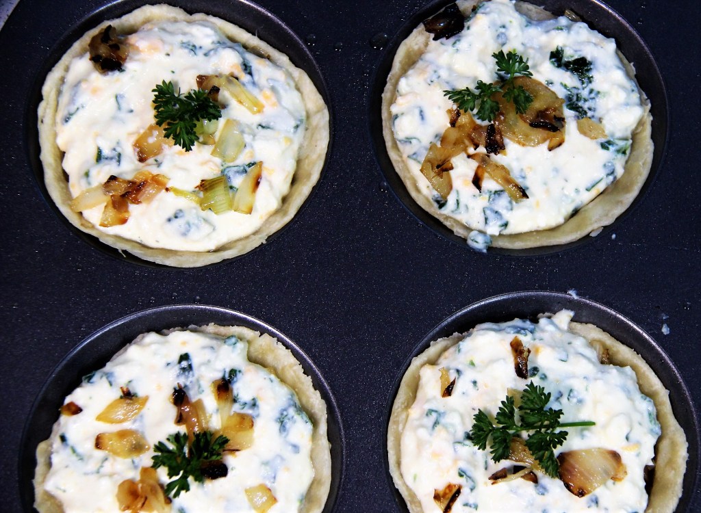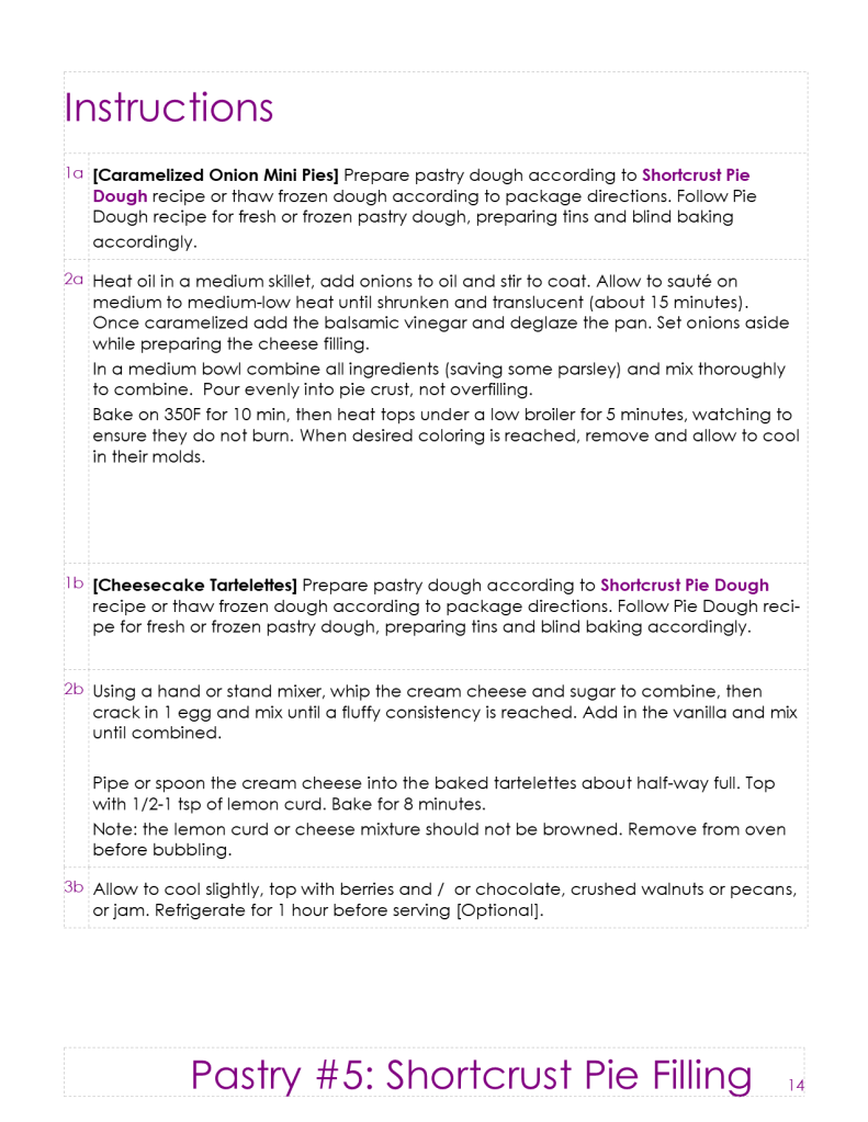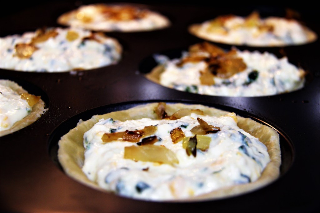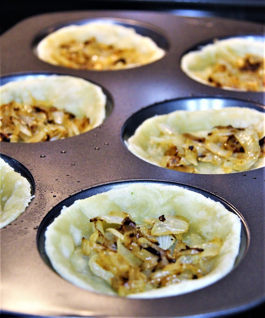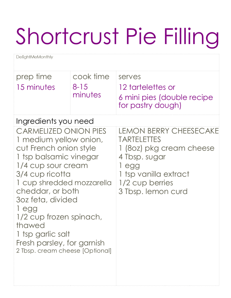 For the fillings, use your favorite cheeses for the Onion Pie and feel free to add mushrooms and chopped bacon if desired. For the Cheesecake Tartelettes, frozen or fresh berries will work but drain the excess juice and do not bake them. Prepare a graham cracker crust for any leftover cheesecake filling and bake and refrigerate those mini cheesecakes.