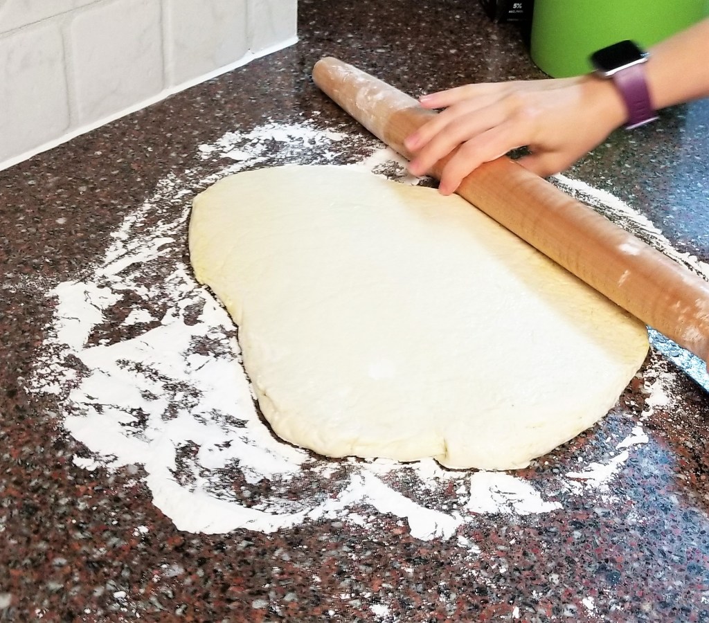 • Roll or spread it out with your gentle fingers. Toss it like a pizza if you have that skill. Make a large round with the dough about 1/4″ thick – fairly thin but no holes.