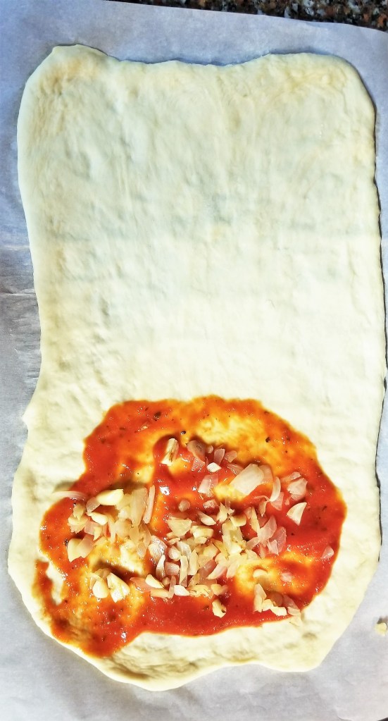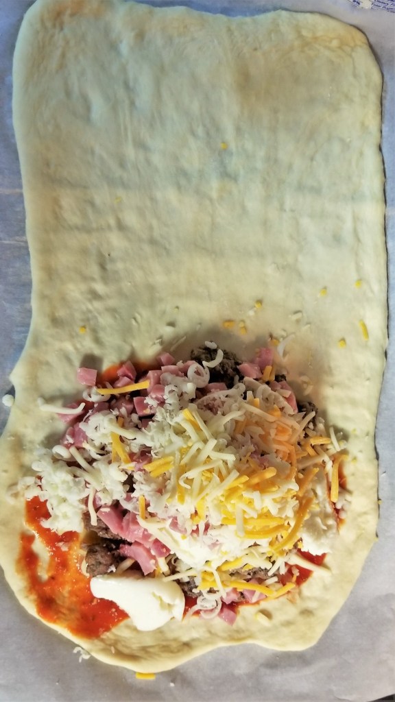 • Starting with the sauce, pile in your favorite dry toppings (to avoid adding any more moisture), leaving room around the edge to seal.