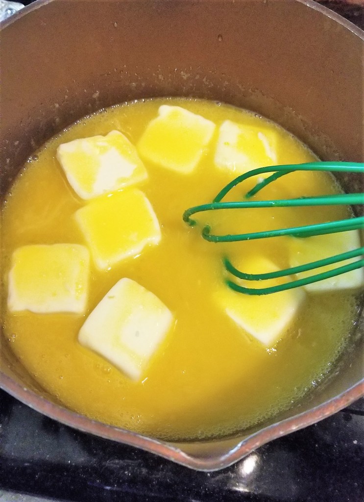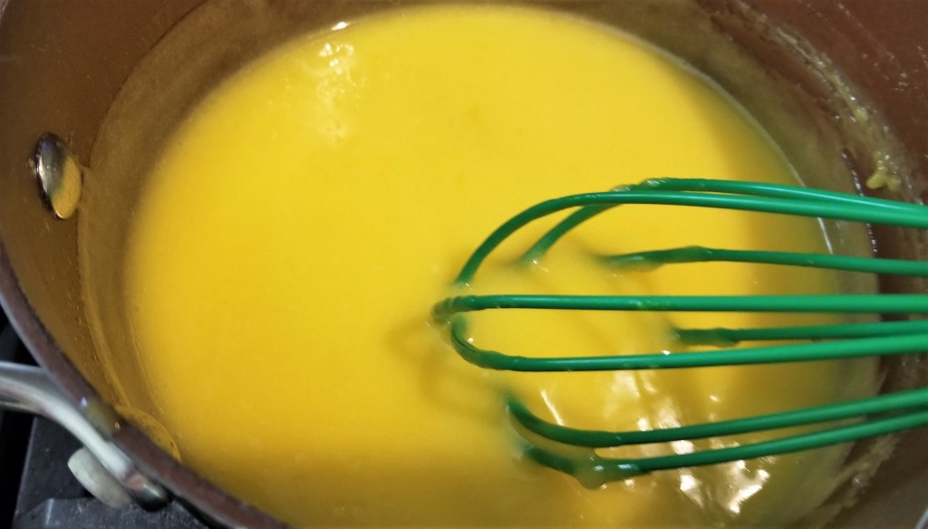 - Remove from heat, continuing to stir. [Option to strain through a mesh sieve if seeds, pulp, or zest remain.]