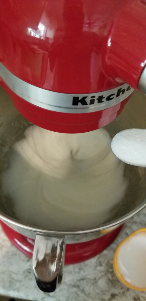 Pop a metal bowl, preferably a stand mixer bowl, and whisk attachment in the freezer while you collect the ingredients. A few minutes in the freezer will suffice to make sure the bowl is very cold or even icy. Pour as much cream into the bowl as the recipe calls for (1/2 to 2 cups) and turn the whisk on. Let the hand or stand mixer whisk the cream while slowly adding sugar (1/4 to 2/3 cup). Sprinkle the sugar in while the whisk whips air into the cream. It will grow and become light and fluffy. Once all the sugar is added, pour in 1/2-1 tsp vanilla to taste, dash of salt, and any jolly food coloring. After a few minutes the cream will be whipped and able to keep its shape. Stop once it has reached a fluffy consistency, do not over-whip. It will be chunky, thick, and like curds if over-whipped.